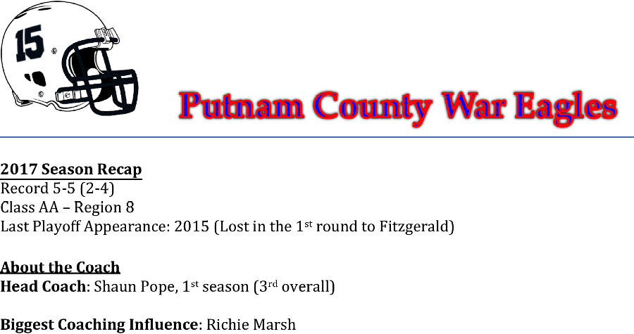 Coach Shaun Pope takes over as head coach for the Putnam County War Eagles. Putnam County narrowly missed the payoffs last season, losing in a mini play-in game to a Monticello team they had beaten earlier in the season. We asked Coach Pope about the biggest challenge for the 2018 season.
