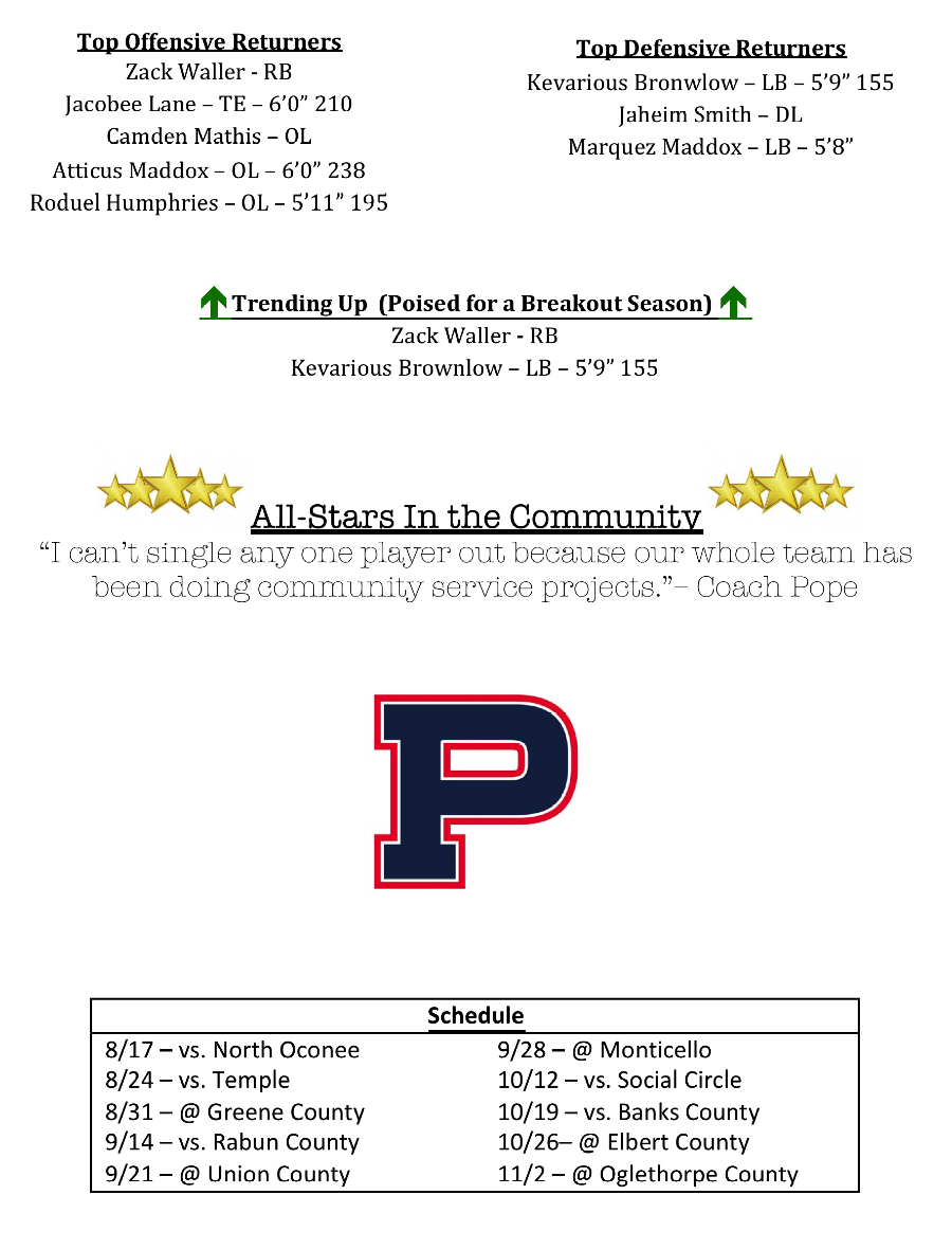 Putnam County returns two experienced lindebackers in Kevarious Brownlow and Marquez Maddox. Brownlow was a Second Team All-Region selection. Jaheim Smith will be called upon to provide leadership on the defensive line for Coach Pope.