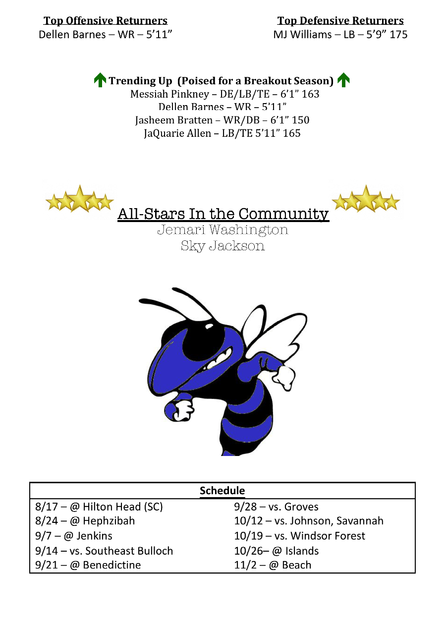 On defense, the Blue Jackets do return Second Team All-Region selection, MJ Williams. Williams was fourth on the team in tackles last season and also tied for the team lead in sacks with five. Messiah Pinkney and JaQuarie Allen are also projected to start on the defensive front seven.