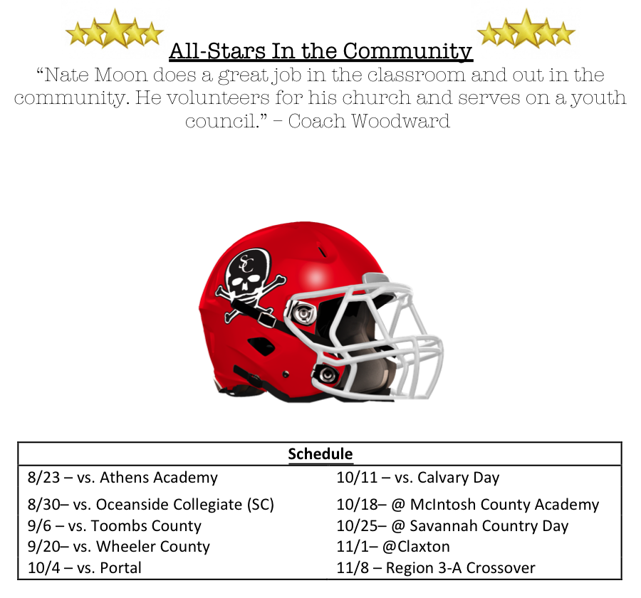 “Nate Moon who was the defensive player of the year for Savannah Quarterback club and he will return at Safety this year. Chase Beard and Blake Brown will return at Linebacker and Defensive back. Dawson Benton will return to the Defensive line. Colby Quinney will look to go both ways this year and he will be a presence on the Defensive line.,” Woodward said.