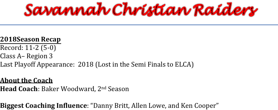 Coach Baker Woodward enters his second year at the helm for the Savannah Christian Raiders. Last season, the former Benedictine Offensive Coordinator led the Raiders into the State Semi-Finals where they were defeated by eventual state champion ELCA. We asked Coach Woodward what his biggest challenge was coming into the 2019 season.