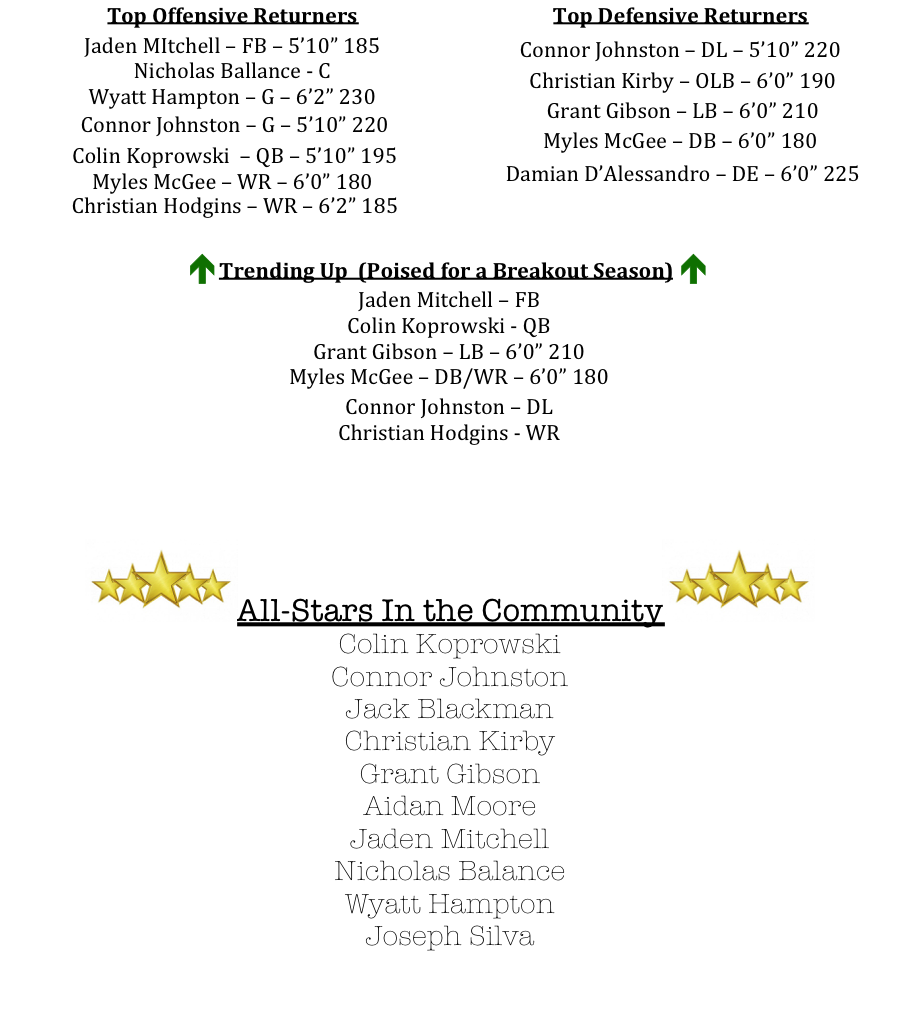 While the Chiefs also lose a lot on defense, they do return their top tackler in linebacker Grant Gibson. Gibson tallied 120 total tackles (71 solo) last season. Christians Kirby will He will join Gibson at linebacker. Up front, Connor Johnston and Damian D’Alessandro will anchor the defensive line and McGee (56 total tackles in 2018) will line up in the secondary for the Chiefs.