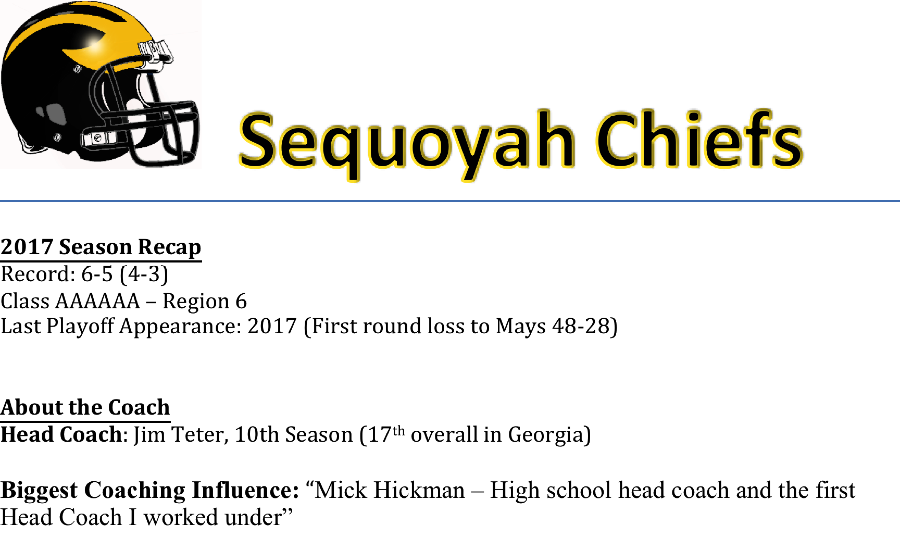 Coach Jim Teter enters his 10thseason as the head coach of the Sequoyah Chiefs. Coach Teter has guided the Chiefs into the post-season in five out of the last six seasons. While folks in Hickory Flat have become accustomed to post season play, Teter knows that each season presents it’s own sets of challenges. We asked Teter about the biggest challenge that his team faces this season.