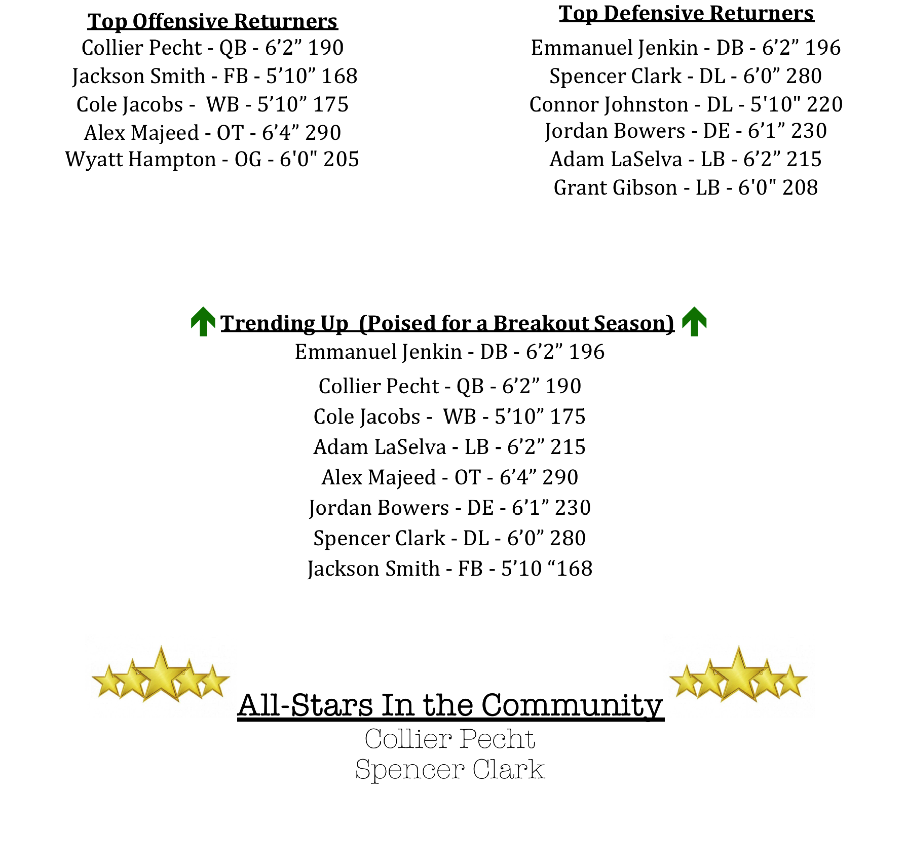 Defensively for the Chiefs, Emmanuel Jenkins (37 tackles, nine pass breakups) has over 10 Division I offers. The defensive line will be a strength with returning starters Spencer Clark, Connor Johnston, Jordan Bowers (six sacks). Several others could see time on the line including Cole Stewart, David Traynor, and the aforementioned Majeed.