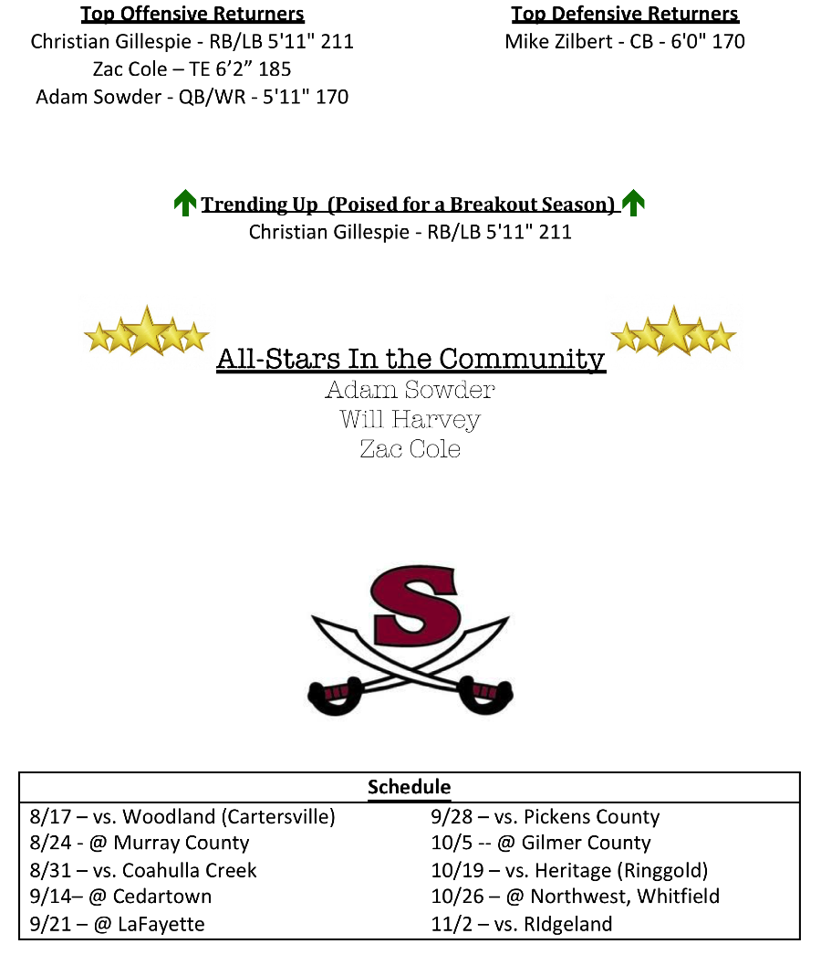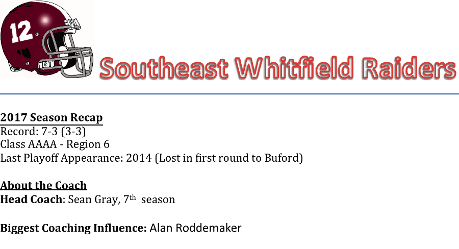 Coach Sean Gray enters his 7thseason at the helm for the Southeast Whitfield Raiders. Coach Gray guided the Raiders to a 7-3 season last year and narrowly missed out on a playoff berth after falling to Pickens High in the play-in tiebreaker game. The seven-win tally was the most wins for the Raiders since the 1985 season.