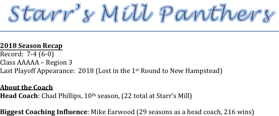 The Starr’s Mill Panthers will be under the leadership of Head Coach Chad Phillips for the 10th season. Coach Phillips has guided the Panthers to five consecutive post season appearances. Last year, the Panthers ran away with the region to claim their 3rd consecutive region title. But the Panthers were upended in the first round of the playoffs. With a new season up ahead, we asked Coach Phillips what was his biggest challenge in 2019.