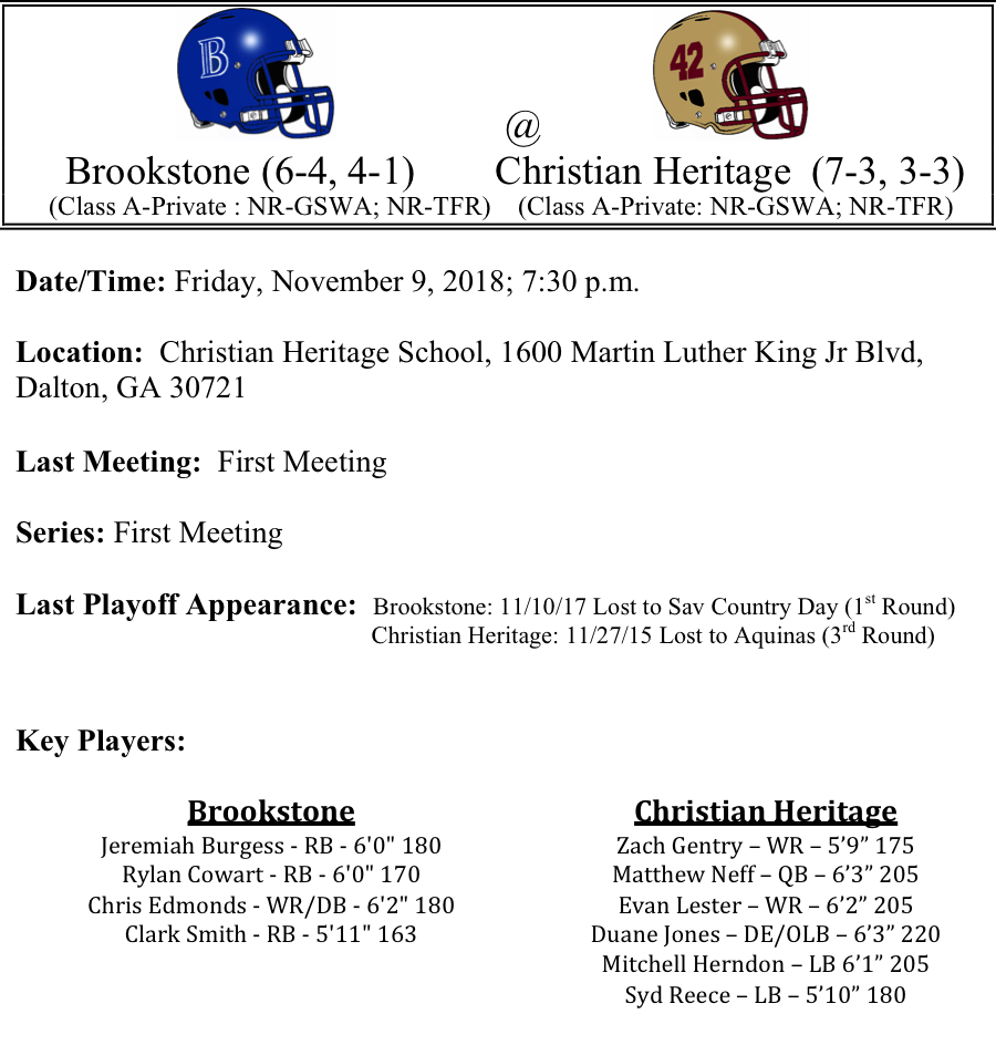 The Brookstone Cougars will travel to Dalton to face the Christian Heritage Lions. Brookstone’s offense is powered by running back Jeremiah Burgess who has rushed for 1,140 yards and 17-TDs. As a team, the Cougars have rushed for almost 3,000 yards on the season. Brookstone is averaging a healthy 40.8 points per game, but the defense is giving up 28.6 points per game. Christian Heritage is led by quarterback Matthew Neff who is having a banner year leading the Lions. Even Lester and Zach Gentry are two big time receivers. The Lions scored a big win early in the season against Mt. Zion, Carroll and proved they can play with the top teams in Class-A. Christian Heritage is only giving up 16 points per game. We think they will be the difference in a close game. We’ll take the Lions by a field goal.