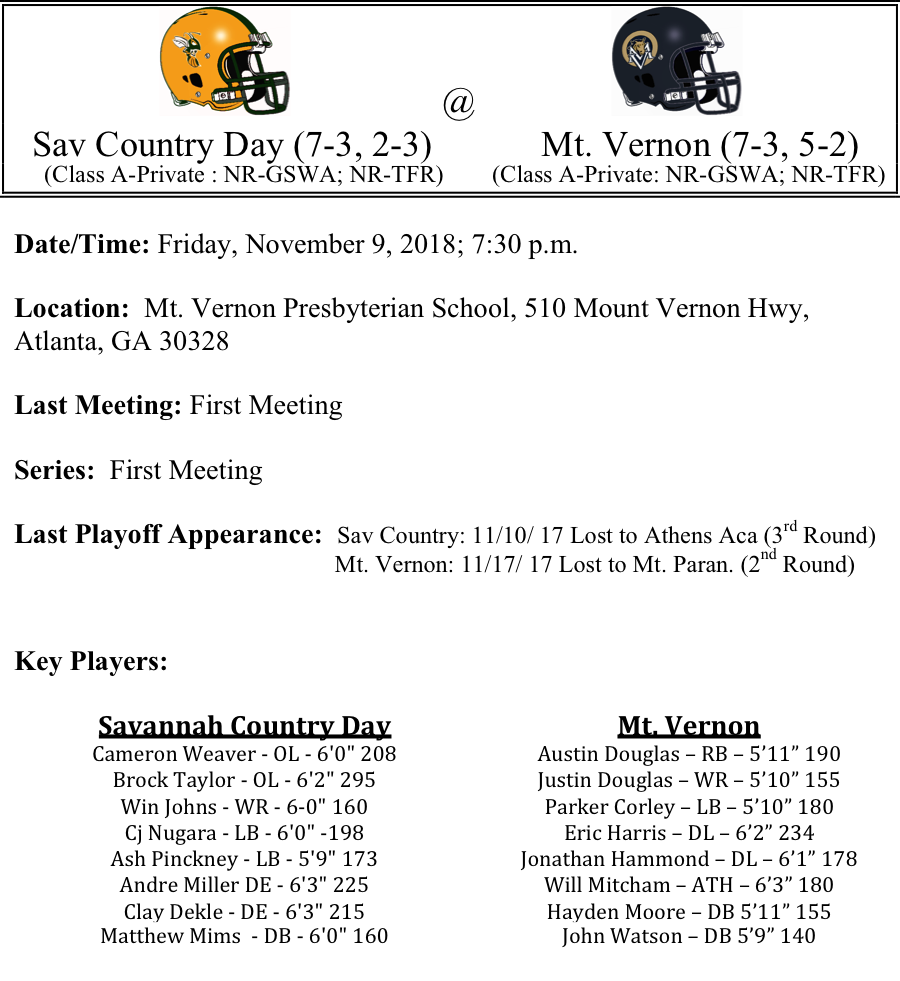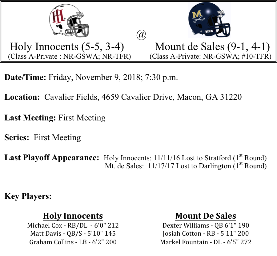 Our first set of Class A-Private playoff previews are listed below. This preview features matchups between Holy Innocents-Mount de Sales, Savannah Country Day-Mount Vernon Presbyterian, Brookstone-Christian Heritage, and Tattnall Square-Wesleyan. Congratulations to all of the teams that have qualified for the playoffs. Best of luck as you play for your teammates, coaches and community this evening.