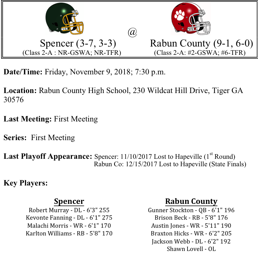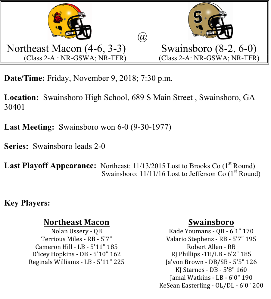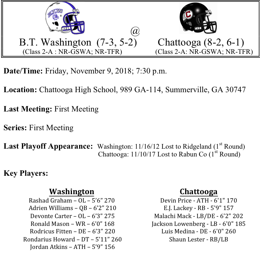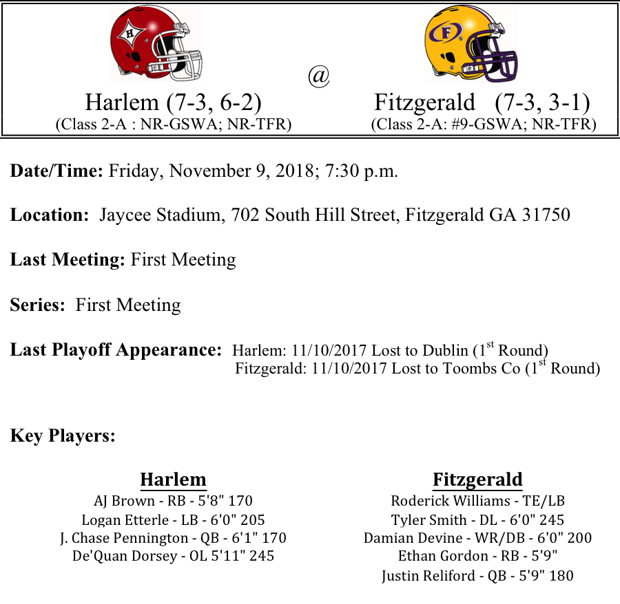 Our first set of 2-A playoff previews are listed below. This preview features matchups between Harlem-Fitzgerald, Northeast Macon-Swainsboro, Washington-Chattooga, and Spencer-Rabun County. AJ Brown and the Harlem Bulldogs will travel to Fitzgerald to take on the Purple Hurricanes. Brown has rushed for over 2,000 yards on the season…Swainsboro will host Northeast Macon Raiders. The Swainsboro defense is only giving up 12.1 points per game…The Washington Bulldogs will travel to Summerville to take on the Chattooga Indians. Can the Bulldogs defense slow down a talented tandem of young running backs for the Indians…The Spencer Green Wave will face off against a red-hot Rabun County Wildcat team. They’ve won 9 straight games. Can they make it ten this week…