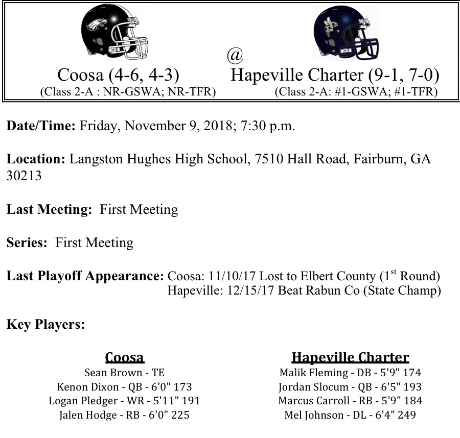 Coosa Eagles will take on the defending state champions Hapeville Hornets. Coosa is averaging a respectable 25.6 points per game while their defense is giving up 28 points per game. The Eagles have been close in games against a handful of playoff teams, but Hapeville is probably like no other team Coosa has faced, save for Rockmart. The Hapeville defense is giving up 3.2 points a game. Their only loss is to 6-A Allatoona. That defense has recorded seven shutouts this season, including a 30-point beating of Heard County. All signs point to a big Hapeville win this season. Hornets by five touchdowns.