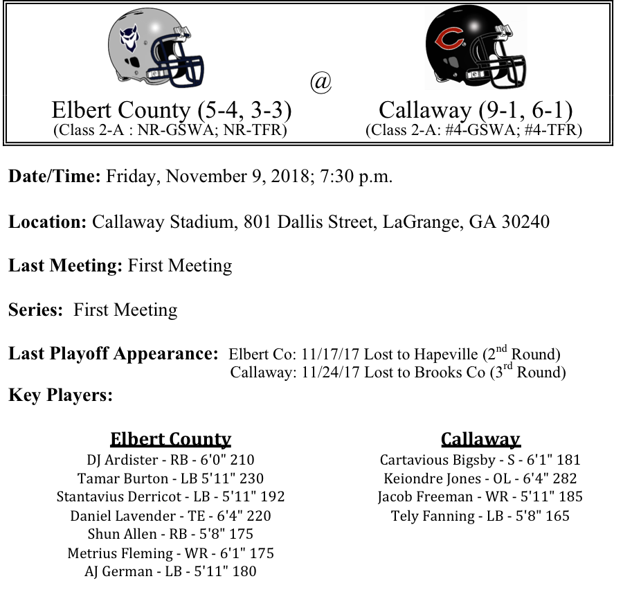 Our final 2-A playoff previews are listed below. This preview features matchups between Washington County-Vidalia, Screven County-Brooks County, Elbert County-Callaway, and Coosa-Hapeville Charter. Washington County has been battle tested but the Vidalia Indians aren’t going to back down. Dyquan Bloodsaw has been electric for Washington County but Vidalia hopes to match him with Chris Gay and Nyshun Bell…Screven County and Brooks County will battle it out in Quitman. Jacolby Brown will look to lead the Trojans to another deep playoff run…Elbert County travels across the state to take on Callaway. Both teams are averaging over 34 points per game so the scoreboard operator at Callaway Stadium could be busy…Hapeville Charter will begin its title defense against the Coosa Eagles.