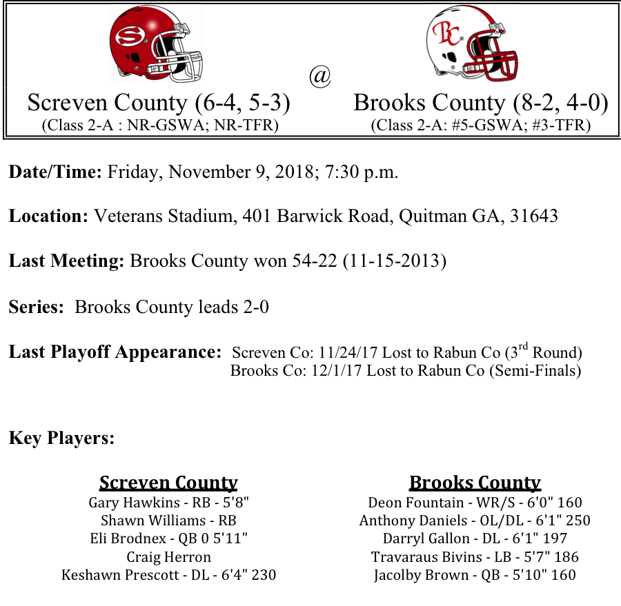 Screven County will travel to Quitman to take on the Brooks County Trojans. The Gamecocks are led by running back Gary Hawkins who has rushed for 1,173 yards and 18-TDs. As a team, the Gamecocks have rushed for 2,782 yards. The Gamecocks are averaging 27 points per game while the defense is giving up 25.4 points. Brooks County is also averaging 27.3 points per game, but the Trojans defense has been a little better, only giving up 16 points per game. Through 9 games, senior Deon Fountain has caught 49 passes for 635 yards, rushed for 306 yards and accounted for 14 total TDs. We think Brooks takes care of business at home this week and beats the Gamecocks by 13.