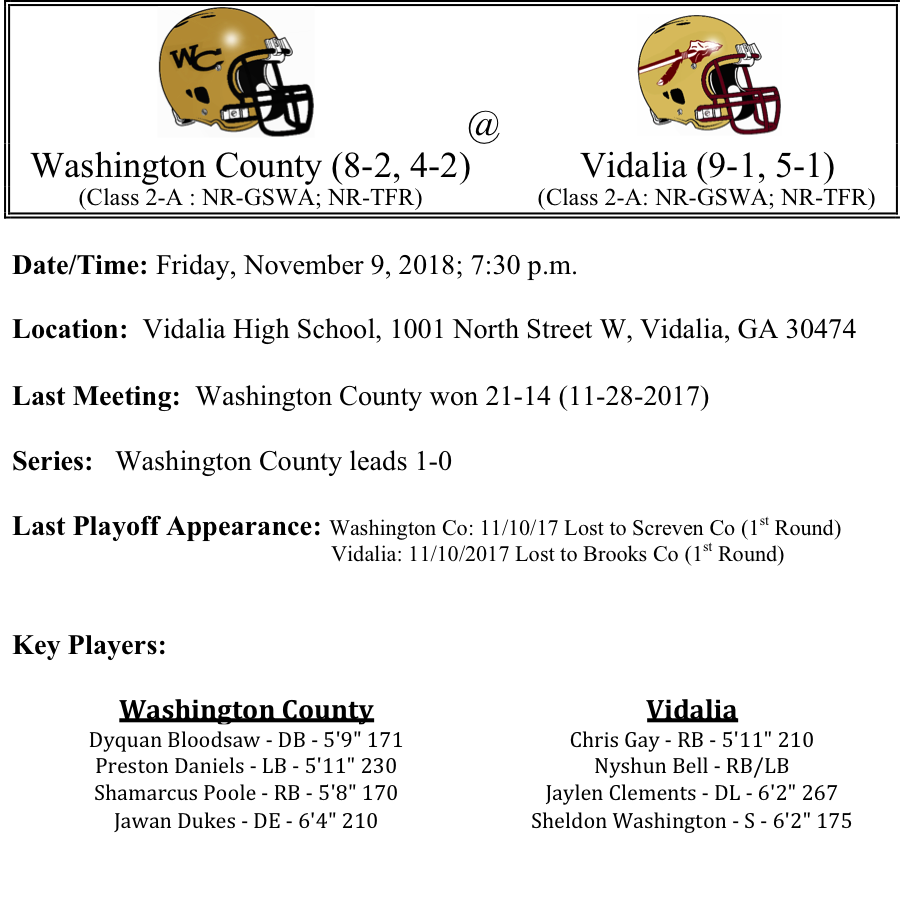 Washington County knocked the Vidalia Indians out of the playoffs in the quarterfinals last season. Vidalia looks to return the favor in week one of the playoffs. Washington County is averaging 36.7 points per game on offense while only giving up 18.4 points per game. Their only losses this season were to top-10 ranked Dublin and Doge County. Dyquan Bloodsaw is an electric player on both sides of the ball. The Vidalia Indians are also scoring in bunches, averaging 34.5 points per game. Their only loss this season is a 7-point setback to Swainsboro. The Indians are powered by Chris Gay and Nyshun Bell, who have combined for 1,707 yards and 18-TDs. Can Bloodsaw and the Golden Hawks slow down Vidalia? We think it will be close, but we like the Indians to win by a touchdown.