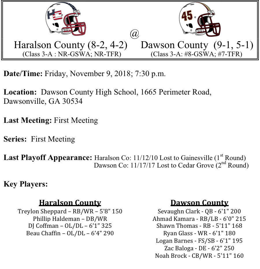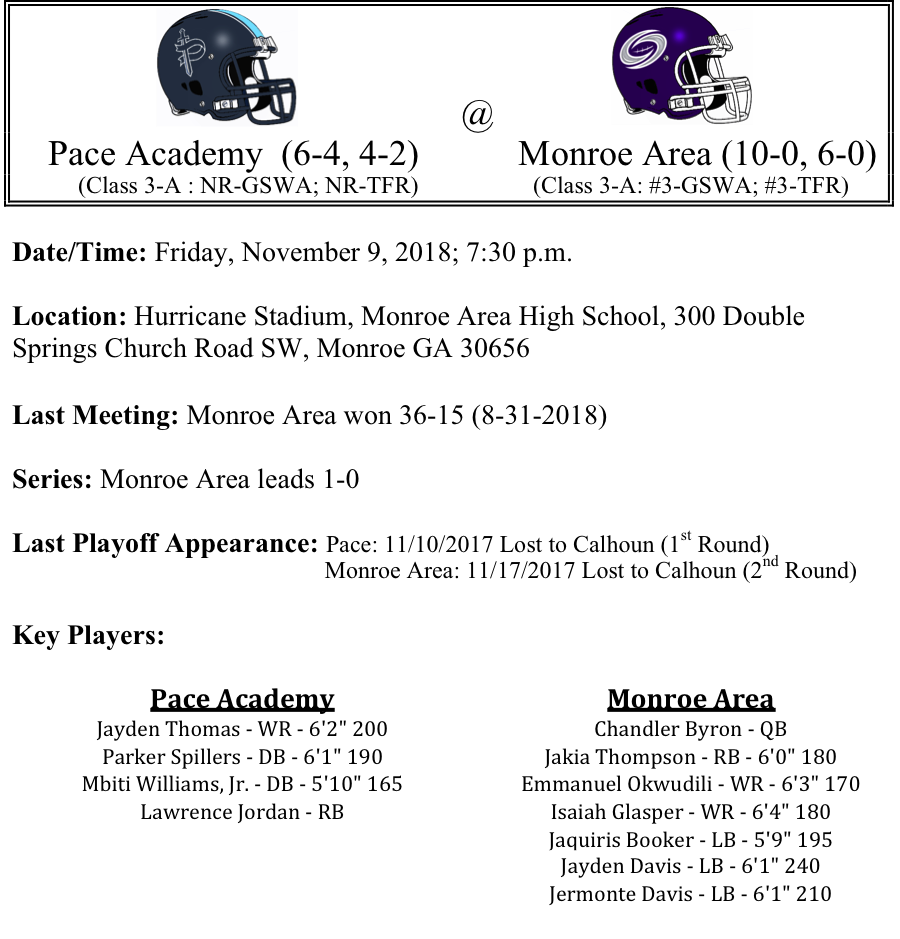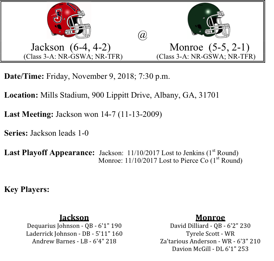 Our first set of 3-A playoff previews are listed below. This preview features matchups between Jackson-Monroe, Windsor Forest-Pierce County, Haralson County-Dawson County and Pace Academy-Monroe Area. Jackson is in the playoffs for the 5th straight year, but will travel to Albany to face Monroe, who is making their second consecutive playoff appearance…Windsor Forest has put up some big numbers offensively, but the Burke Co. Bears defense has recorded five shutouts on the season. Can Windsor Forest break through against a stingy defense…Haralson County will brig with them the Class 3-A’s top rusher this season in Traylon Sheppard as they visit Dawson County. But Dawson County as a team has put up some big numbers on the ground. Will Sheppard and Haralson be able to match the Tigers…Finally, Pace Academy will get another shot at Monroe Area as the teams faced off earlier this season. Will it be more of the same, or can Pace do something no one else has done this season, which is beat Monroe Area…