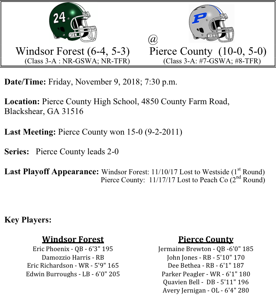 Windsor Forest will attempt to be the first team to defeat the Pierce County Bears this season. The Knights are led by quarterback Eric Phoenix, who has passed for 1,571 yards through eight games with 15-TDs. Damozzio Harris leads the team in rushing with 840 yards and 10-TDs through eight games. The Knights have put up some big numbers on offense and are averaging 35.6 points per game, while the defense is giving up 19.5 points per game. After winning in convincing fashion in the first eight games, the Peirce County Bears have won two nail-biters in the past two weeks to stay undefeated. The Bears defense has recorded five shutouts on the season.John Jones has rushed for 1,300 yards on the season with 19-TDs. Dee Bethea has chipped in 561 yards rushing, 421 yards receiving and 15 total TDs. Windsor Forest might not have the horses this year to run with Pierce County, we like the Bears by 17.
