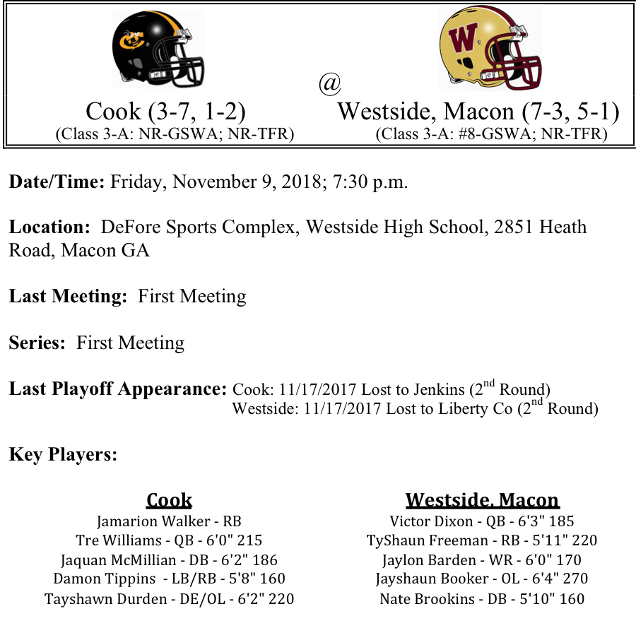 The Cook Hornets had a down year, but still managed to qualify for the state tournaments. The Hornets get most of their production on the ground. The future looks bright, with freshman running back Jamarion Walker rushing for 1,031 yards on the season. Junior Tre Williams has also added 485 yards on the ground. Unfortunately for Cook, they’ve had some trouble getting the ball into the end zone; they are averaging 17.3 points per game. Conversely, their opponent this week, the Westside, Macon Seminoles, are averaging 29.1 points per game. Leading the way for the Noles is junior quarterback Victor Dixon (1,549 yards, 14-TDs and senior running back Ty Freeman (1,080 yards, 12-TDs). The Westside defense is led by defensive back Nate Brookins, who has intercepted 8 passes on the season. Cook looks to be a year or two away from making a deep run. We like Westside Macon by two touchdowns this week.