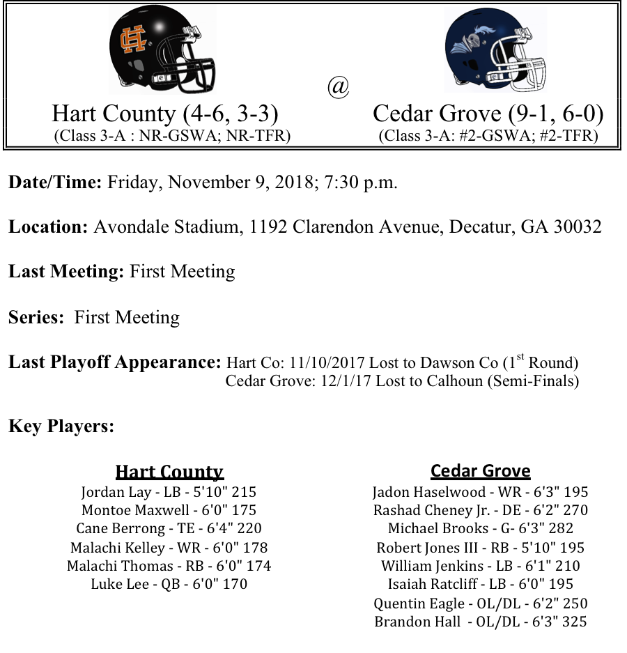 Our second set of 3-A playoff previews are listed below. This preview features matchups between Cook-Westside Macon, Tattnall County-Benedictine, North Hall-Lakeview Ft. Oglethorpe, and Hart County-Cedar Grove. The Cook Hornets have had a down year with respect to the last few season. They are young and might be a year or two away before getting back to where they have been. Westside Macon will be no easy challenge for the Hornets this week…Tattnall County will face one of the toughest opponents in the 3-A bracket as they tangle with Benedictine. It could be a long night for the Battle Creek Warriors…North Hall takes a very good rushing attack to far Northwest Georgia to face Lakeview, Ft. Oglethorpe (LFO). Can LFO slow down the Trojans ground machine…Finally, Hart County travels to Decatur to take on the Cedar Grove Saints. What will Hart County’s plan be to slow down one of the nation’s top receivers and one of the state’s top offenses…