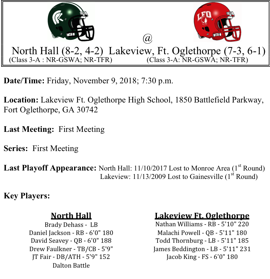 Lakeview Ft. Oglethorpe will host a very dangerous North Hall team this week in round one. The North Hall Trojans enter the game averaging 43.1 points per game. Through 9-games, Daniel Jackson led the team in rushing with 862 yards and 16-TDs. JT Fair has added 635 yards as well. The Trojans are averaging just over 5 pass attempts per game. The North hall defense is giving up 10.1 points per game; they’ve not given up more than 21 points in a game this season. Lakeview Ft. Oglethorpe (LFO), comes into the game averaging 29.4 points per game. Like the Trojans, LFO depends heavily on the run. Nathan Williams leads the charge for the Warriors with 947 yards and 11-TDs. This might be one of the shortest games in the playoffs this week as there shouldn’t be much passing going on. Regardless of the game time, we like North Hall to come out on top by 10 points on the road.