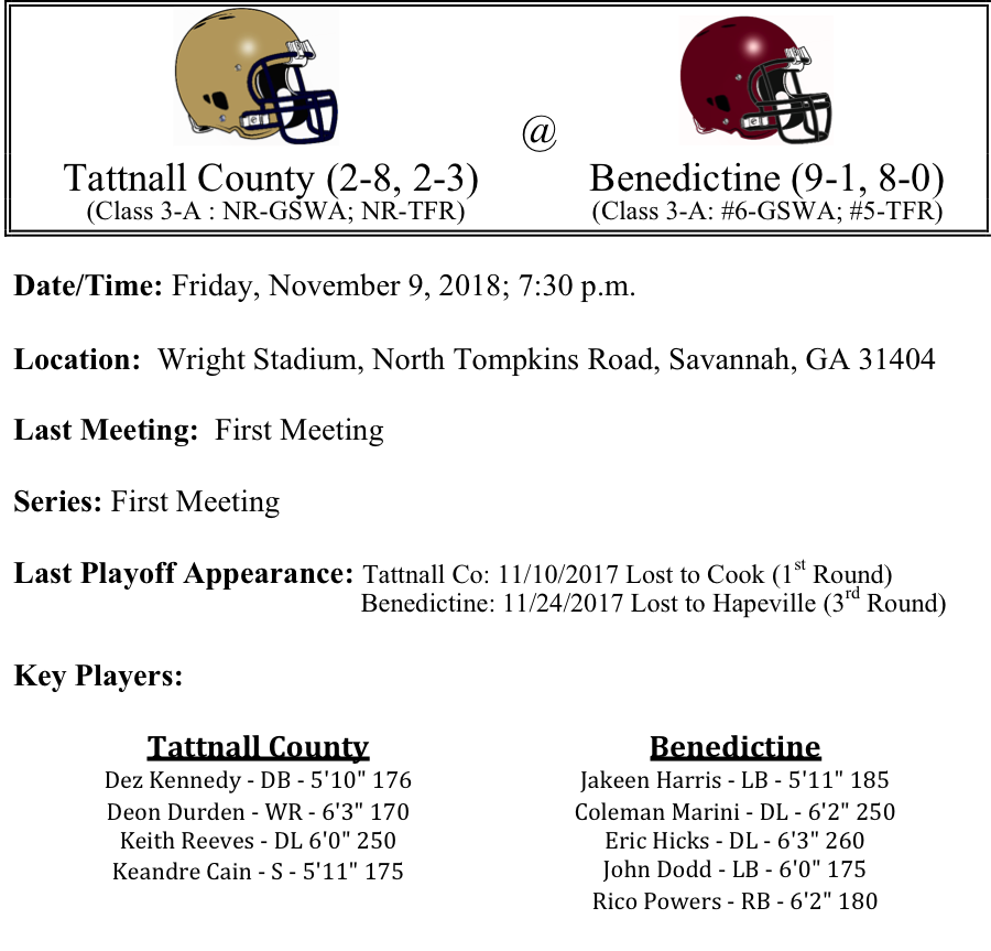 Tattnall County has the fewest amount of wins for any of the playoff teams in Class 3-A. The Battle Creek Warriors won just enough to qualify as the 4-seed in Region-2. Tattnall County has had their share of struggles on offense this season. The Battle Creek Warriors are averaging just over 14 points per game. However, Tattnall has not been shut out this season in spite of some of their woes on offense. Benedictine jumps up to class 3-A this season. So far the only blemish on their record is a loss to Class 4-A Blessed Trinity. Benedictine is averaging 40.9 points per game and the defense is only giving up 9.1 points per game. This game could get out of hand in a hurry. We like the Benedictine Cadets by 5 touchdowns this week.