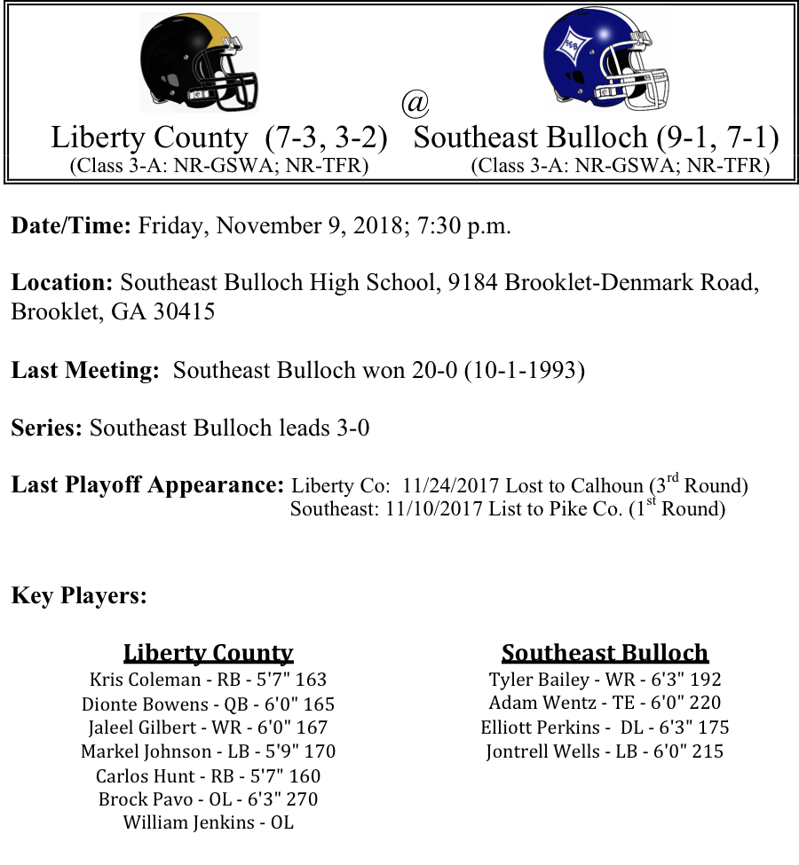 Our third set of 3-A playoff previews are listed below. This preview features matchups between Liberty County-Southeast Bulloch, Ringgold-Peach County, Westminster-Jefferson, and North Murray-Greater Atlanta Christian. Liberty County will bring their 1,500 yard running back Kris Coleman into Brooklet to face the Southeast Bulloch Yellow Jackets. Southeast Bulloch’s defense has been tough this season. Can they contain Coleman and the Panthers…Ringgold earns the 3-A At-Large bid. Their opponent is traditional power Peach County. Peach is undefeated in games against 3-A opponents this season and scores points in bunches. Can Ringgold keep up this week…The Jefferson Dragons have been without their starting quarterback for the last 4 games. Will they be able to hold off a very good Westminster team…Finally, one of Northwest Georgia’s best passers, Preston Paog and the North Murray Mountaineers will travel to Norcross to face a tough Greater Atlanta Christian defense. Will the Mountaineers be able to get going offensively this week…