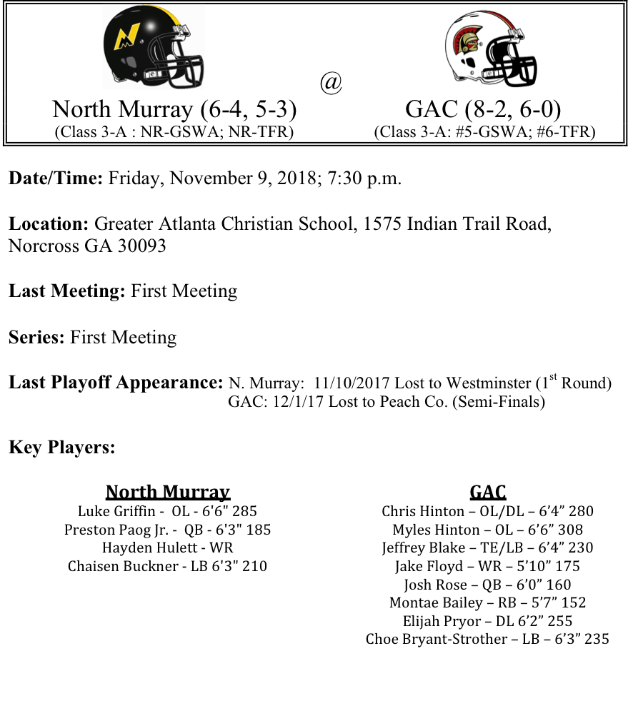 The North Murray Mountaineers will travel to Norcross to take on the Greater Atlanta Christian Spartans. North Murray is led by quarterback Preston Paog Jr.; he has led North Murray to 27.7 points per game on offense. Paog will need a big night this week if North Murray wants to extend their season. They face a GAC defense that is only giving up 13.1 points per game. The Spartans area also averaging 30.9 points per game. Josh Rose has passed for 1,366 yards and 12-TDs. This looks like an uphill battle for North Murray. Will we believe GAC is beatable, we don’t think the Mountaineers are deep enough to keep pace. We like the Spartans by 15.