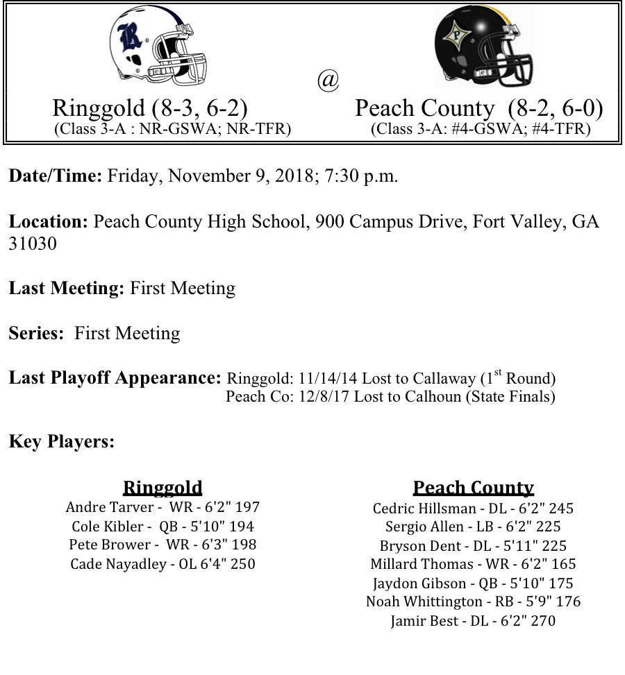 The Ringgold Tigers earned the at-large bid for Class 3-A. They will be matched up with the Peach County Trojans. Ringgold is averaging 26 points per game on the season. The Tigers are giving up 20 points per game, but they have not defeated a playoff team this season. Peach County on the other hand is looking to get back to the Benz for some redemption. The Trojans are averaging 38.1 points per game on offense. They are missing some of the star-power form 2017,but they did more than enough to go undefeated in region play. Their only losses were to 6-A power Lee County and 4-A power Mary Persons. Jaydon Gibson leads the Peach County offense with 1,438 passing yards and 14-TDs. Peach County should win this game going away. We like the Trojans by 24 this week.