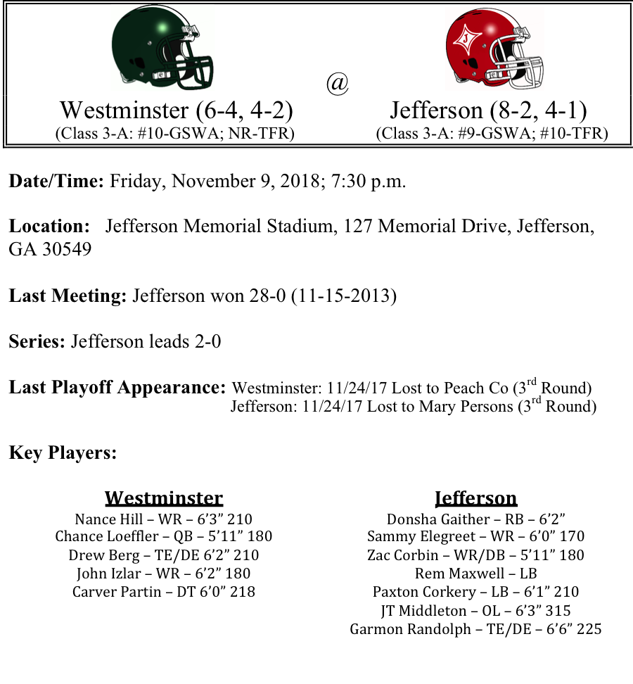 The Jefferson Dragons will host the Westminster Wildcats in what should be the best first round matchup in Class 3-A. The Wildcats come into the game averaging 28.9 points per game. They also have big wins this season over GAC, Woodward Academy and Pace. Their defense is giving up 20.5 points per game. Westminster did lose a close game to rival Lovett last week, will that loss be looming in the back of their minds?The Jefferson Dragons are averaging 35 points per game on the year. They have played without starting QB Colby Clark for most of the season. Clark is a dual threat QB. He still leads the team in rushing yards with only 6 games played this year. The Dragons have relied heavily on the run this season; as a team Jefferson has rushed for 2,694 yards. We don’t know if Clark will be available for the game this week either way this is a tough spot for the Dragons. We’ll take the visiting Wildcats by a field goal.