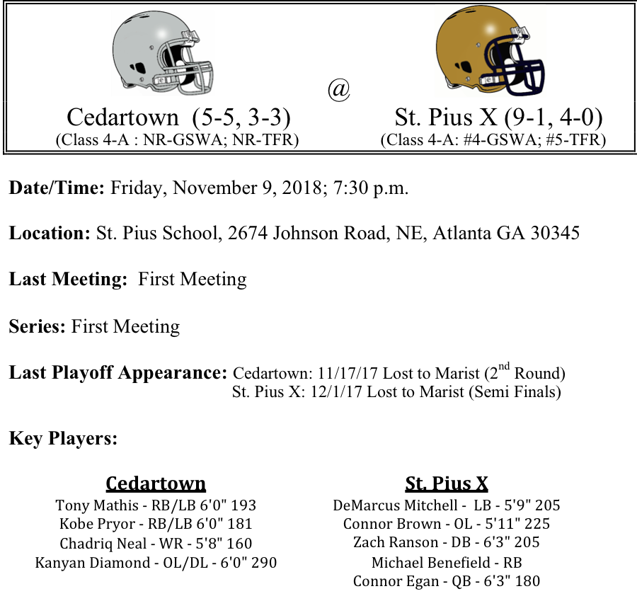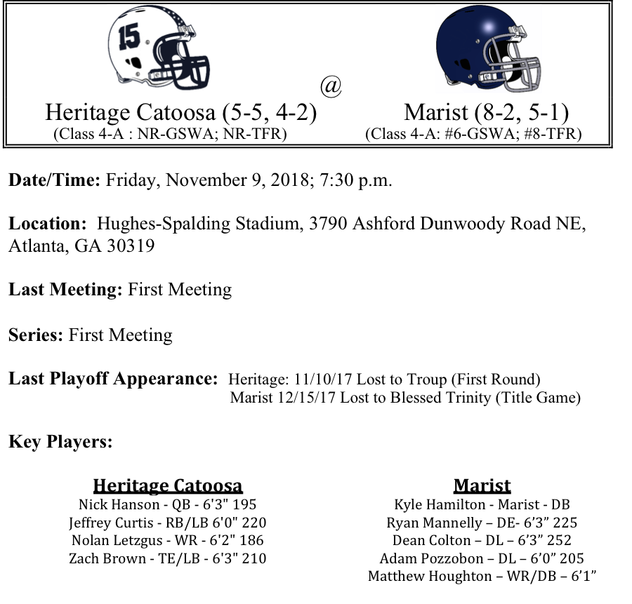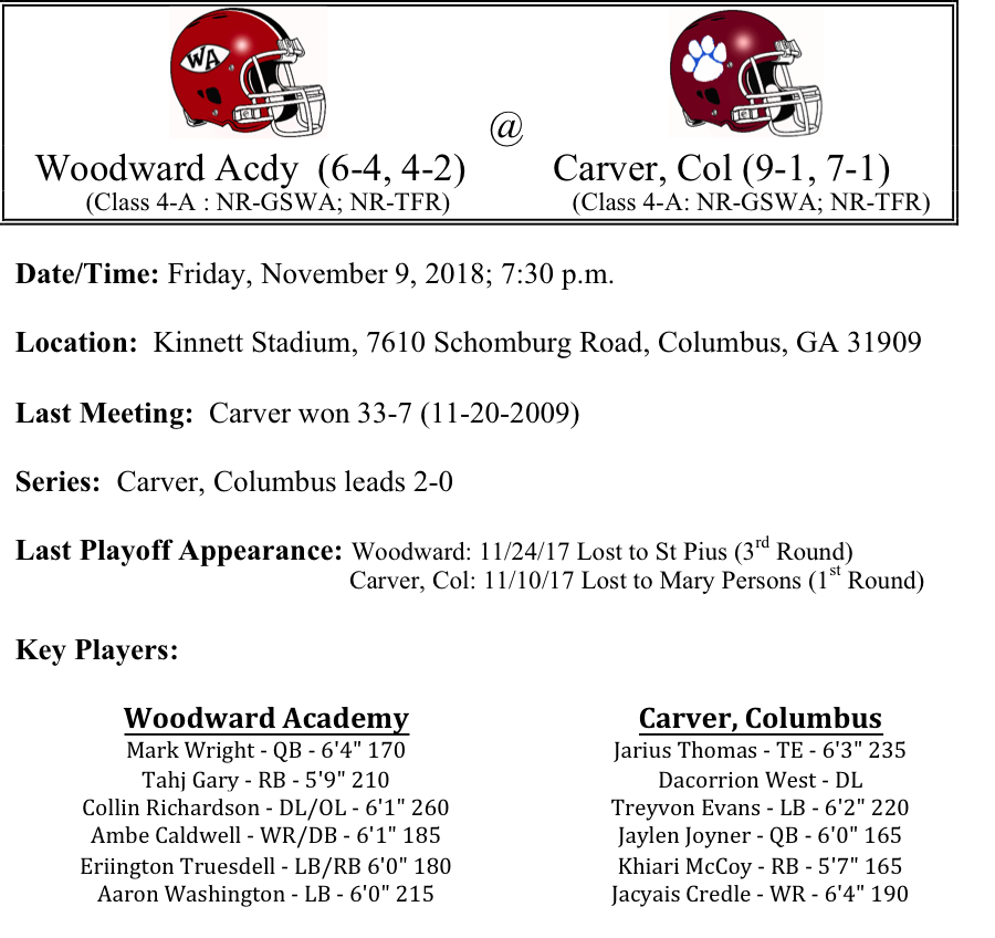 Our first set of 4-A playoff previews are listed below. This preview features matchups between Woodward Academy-Carver, Richmond Academy-Mary Persons, Heritage-Marist, and Cedertown-St.Pius. The Woodward Academy War Eagles are on the road against the Carver Columbus Tigers. Both teams are averaging over 35 points per game, so the scoreboard operator at Kinnett Stadium could be busy on Friday…Richmond Academy visits Mary Persons. Will the Musketeers be up to the task of stopping J.T Heritage and Quen Wilson…Heritage travels to Marist as the teams meet for the first time ever. Marist has had a week off to prepare. Has the sting of the loss to Blessed Trinity gone away…Finally, Cedartown visits St. Pius. The Cedartown defense has been pretty good this season, but can they defense bottle up Connor Even and Michael Benefield. This might be the toughest 1 vs 4 matchup in the 4-A bracket…