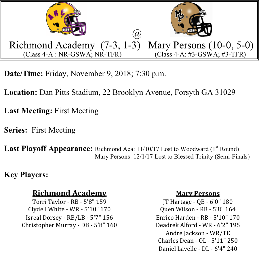 The Richmond Academy Musketeers started out the season with six straight victories, but lost three out of their last four games to end the season. The offense has been productive, scoring 27.3 points per game while the defense is giving up a very respectable 16.7 points per game. Torri Taylor rushed for 1,001 yards on the season with 11-TDs. Meanwhile, Mary Persons continued its dominance this season, scoring 46.7 points per game on their way to an undefeated regular season. J.T. Hartage has passed for 2,097 yards and 21 TDs while Quen Wilson has rushed for 1,299 yards and 21-TDs. Mary Persons is one of the best teams in 4-A and we expect them to prove that this Friday. We like the Bulldogs by three touchdowns.