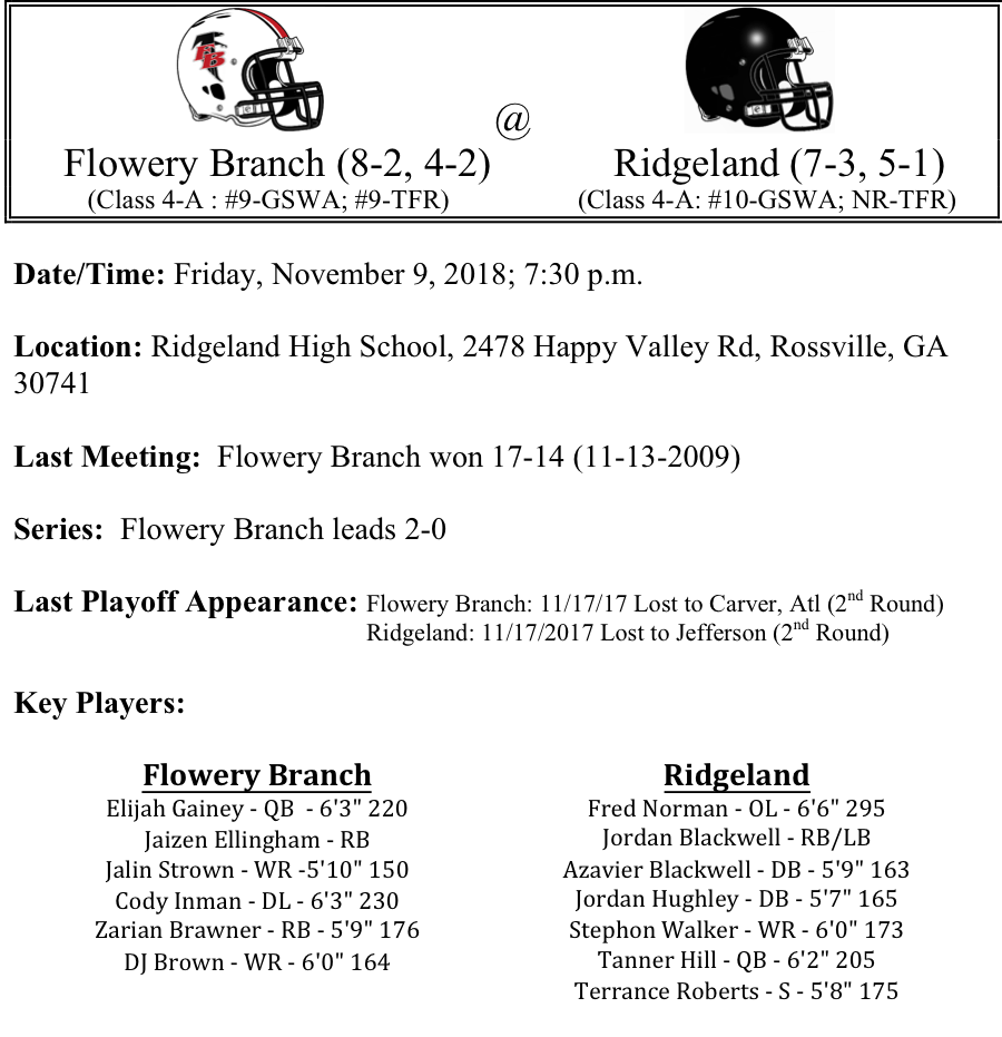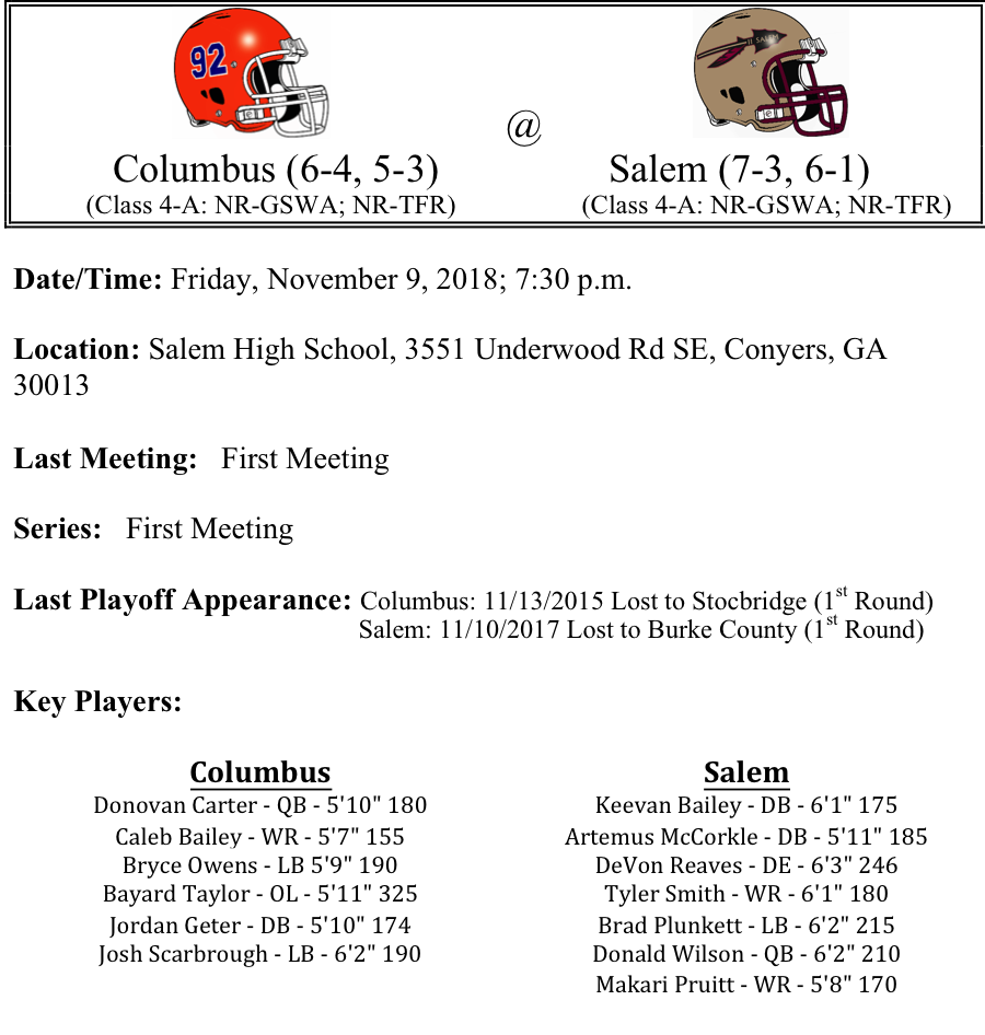 Our second set of 4-A playoff previews are listed below. This preview features matchups between Columbus-Salem, Perry-Baldwin, Flowery Branch-Ridgeland, and Stephens County-Cartersville. Salem will be looking to the passing game to get past Columbus this week. Do the Blue Devils have an answer in the secondary for the Seminoles air-raid…Perry goes on the road to Baldwin, but the Panthers look like the more prolific offense this week. Can Baldwin bow up and defend home field…Flowery Branch and Ridgeland should be a great game. Flowery Branch quarterback Elijah Gainey can really sling it, but he’s got to be accurate or the Ridgeland defense will make him pay…Stephens County travels to Cartersville. The Canes have looked almost unstoppable this season. But the better not be looking past a well coached Indians team.
