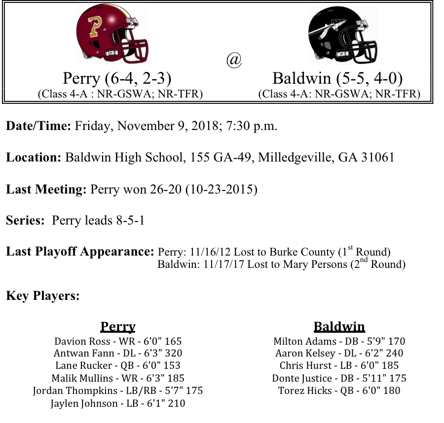 The Perry Panthers started off the season with four straight wins, but lost four of their last six to close out the season. The Panthers are averaging 26.4 points per game, but their defense is giving up 25.8 points. Lane Rucker has passed for 2,790 yards and 19-TDs. His primary target ahs been Davion Ross who has hauled in 58 catches for 862 yards and 5-TDs. Perry will travel to Milledgeville to face the Baldwin Braves, the No. 1 team from region 3. The Braves dropped their first five games but have turned things around the second half of the season with five straight wins. The Braves are averaging 19.8 points per game this season, but during their current win streak, that has increased to 26 points per game. The defense has also tightened up during the win streak, giving up 6.8 points per game in that same five game stretch. This game should be nip and tuck. We think that Perry, who is making their first playoff appearance in 6 years, will get the win by a field goal.