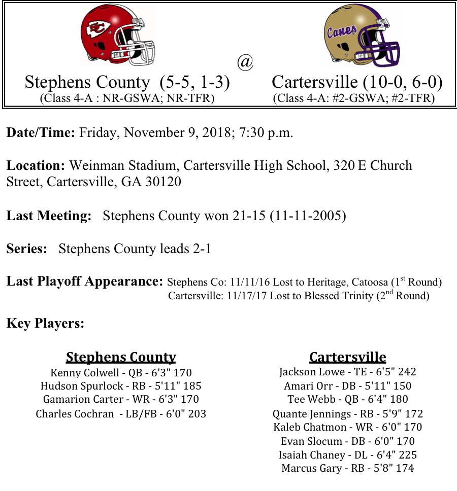 The Cartersville Hurricanes have been scoring points at a furious pace this season as they average 40 points per game. Tee Webb has done well at quarterback, passing for 2,103 yards and 25-TDs. Senior running back Marcus Gary has rushed for 859 yards and 12-TDs in nine games this season. Cartersville has been stout on defense this season, holding opponents to 6 points per game, including 4 shutouts. The Stephens County Indians have dropped three out of their last four games coming into the playoffs. They are averaging 19.8 points per game and the defense is surrendering 24.7 per game. Those numbers don’t bode well with the matchup in Cartersville looming on Friday. Cartersville should flex their muscle this week. We like the Canes by five touchdowns.