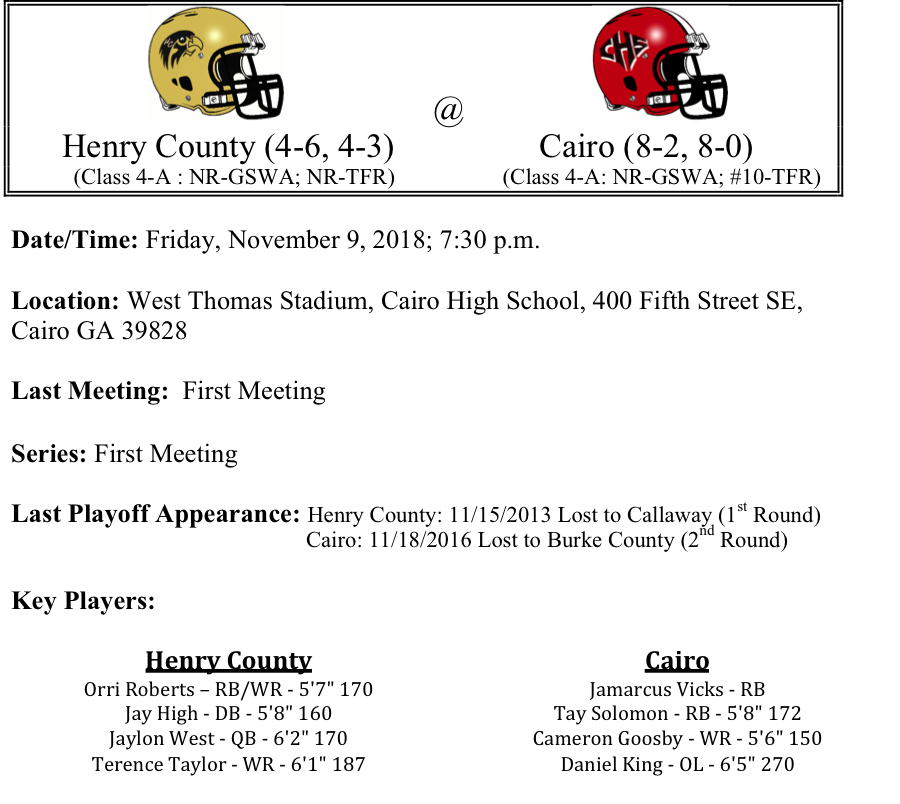 Henry County is back in the playoffs for the first time since 2013. They will travel to Cairo to take on the Syrupmakers. Henry County Will lean on the passing of Jaylon West to help guide them this week. The Hawks are averaging 20.1 points per game on offense, but their defense is giving up 26.4 points per game. Meanwhile the Syrupmakers are on an eight game win streak. They are averaging 32.1 points per game while the defense is only surrendering 11 points per game. The Syrupmakers rely primarily on the run game. Tay Solomon and Robert Peters have combined for over 1,000 yards on the season and 17-TDs. We believe Cairo won’t have much trouble this week against Henry County. We like Cairo by three touchdowns.