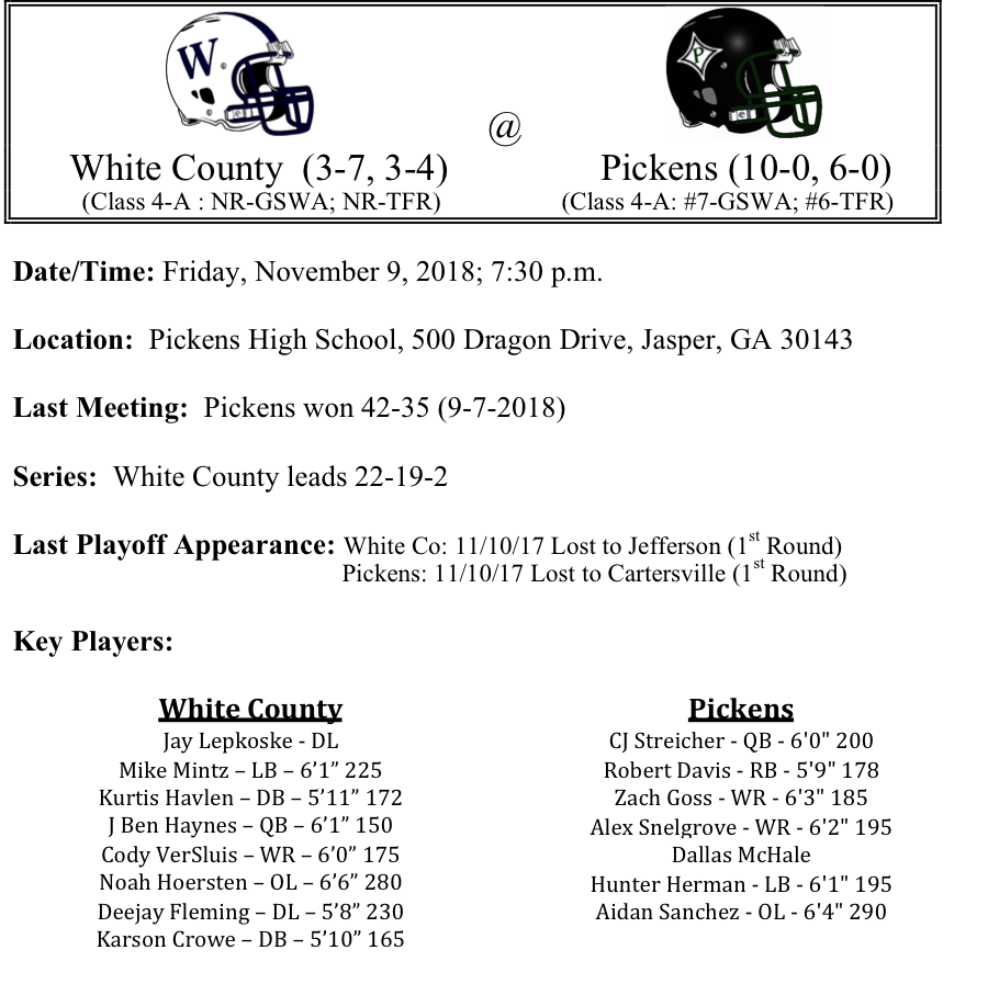 The White County Warriors and Pickens Dragons will face off for the second time this season. Pickens got the best of their North Georgia rival back in September, so you can bet White County will be looking for some redemption. Sophomore quarterback J. Ben Haynes has passed for 1,291 yards for the Warriors. As a team, White County has rushed for over 1,400 yards on the season. The Pickens Dragons have had the best season in school history, going undefeated and winning the region title. They are averaging 46.4 points per game on the season, while the defense is only allowing 13.3 points. Dual threat quarterback C.J. Streicher leads the Dragons offense with 1,167 yards passing, 934 yards rushing, and 30 total TDs. Senior running back Robert Davis has added 697 yards and 12-TDs. The first game was decided by 7-points, but we don’t think that this one will be as close. We like the Dragons by three touchdowns.