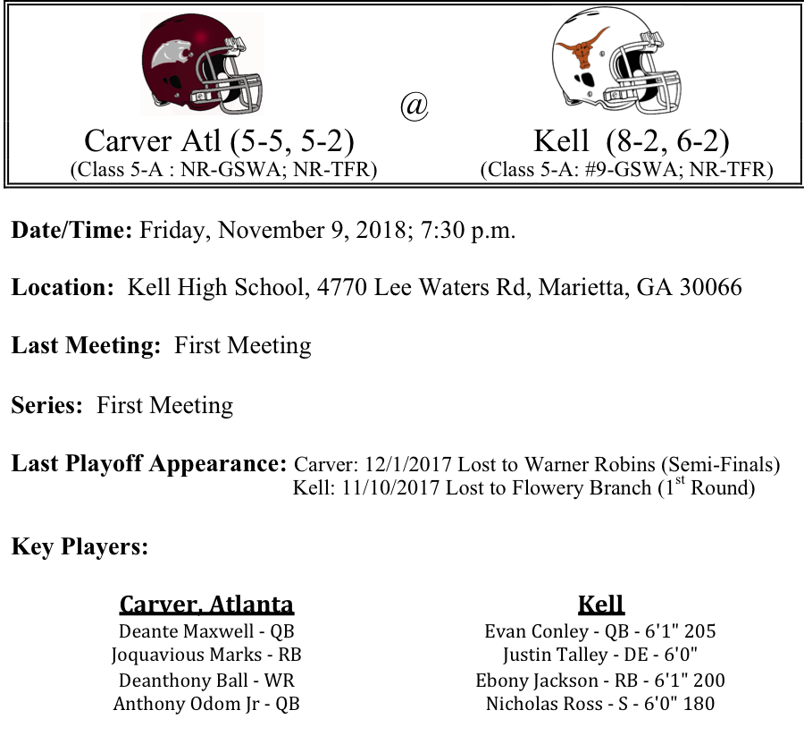 Coach Darren Myles and his Carver Atlanta Panthers will make the trek to East Cobb to take on the Kell Longhorns. The Panthers have been up and down this season. They are averaging 23.9 points per game this year. Quarterback Deante Maxwell has passed for 1,633 yards and 13-TDs while Joquavious Marks has rushed for over 1,400 yards. Tony Jones has also chipped in over 800 yards on the ground. Kell’s offense is powered by senior quarterback Evan Conley. Last week, Conley passed for 263 yards and 4-TDs in a tune-up game. Kell is averaging 36.8 points per game. We think they get close to that number this week and take down the Panthers. Kell wins by 17 this week.