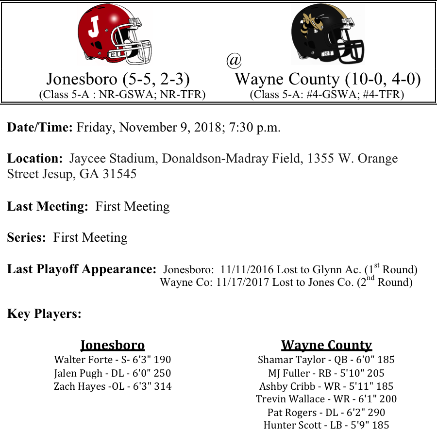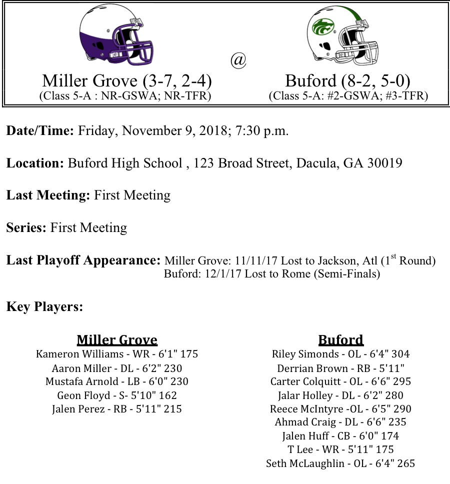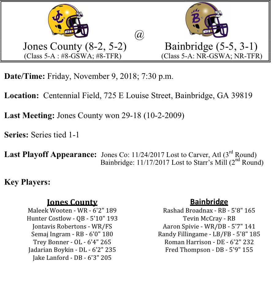 Our first set of 5-A playoff previews are listed below. This preview features matchups between Jones County-Bainbridge, Jonesboro-Wayne County, Carver, Atlanta-Kell, and Miller Grove-Buford. Jones County travels to Southwest Georgia to face a young but talented Bainbridge squad. Can the Bainbridge Bearcats slow down the Jones County air-raid…The Wayne County Yellow Jackets looked prime for another deep playoff run. Does Jonesboro have any threat that can slow down the Jackets…Kell has put together another great season. Looming large is a second round matchup against Buford, but first they’ve got to take care of Carver Atlanta. The Panthers Deante Maxwell and company may have something to say about that…Finally Buford looks primed for another deep run. Is there any chance for Miller Grove…