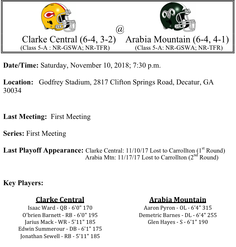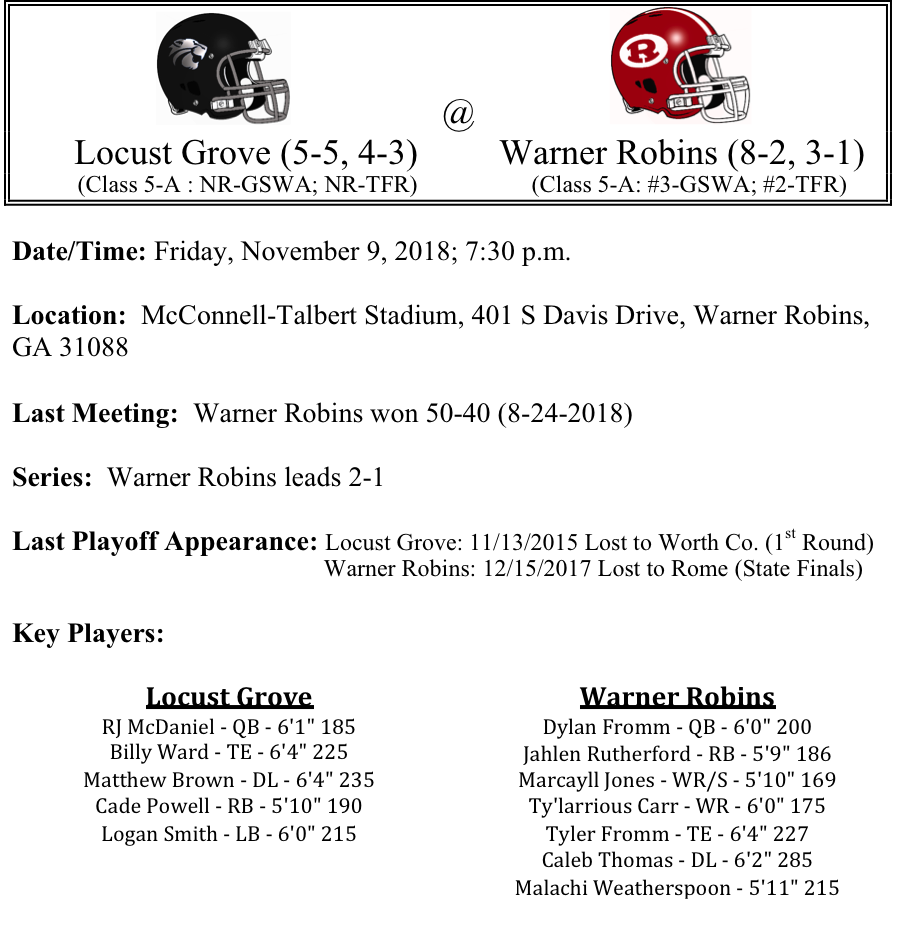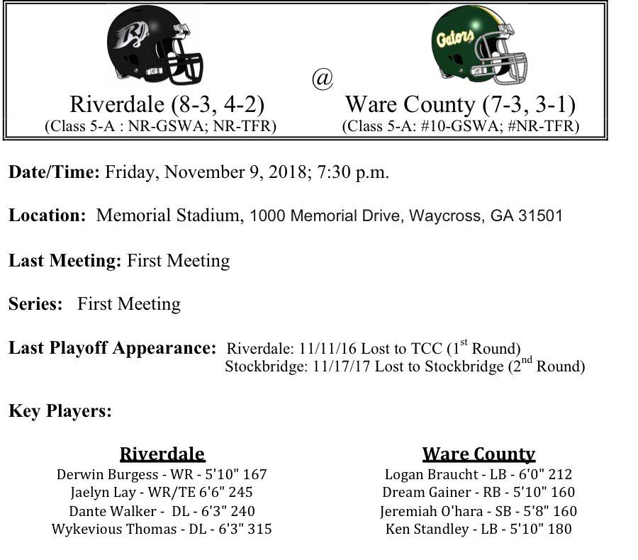 Our final set of 5-A playoff previews are listed below. This preview features matchups between Riverdale-Ware County, Locust Grove-Warner Robins, Clarke Central-Arabia Mountain, and East Paulding-Banneker. Riverdale’s defense will try to slow down Ware County’s freshman quarterback this week as they travel to Waycross…Both Warner Robins and Locust Grove have quarterbacks that can sling it around the field. Which one will have the better night on Friday and lead their team to victory…Clarke Central and Arabia are set to tangle on Saturday in what has the makings of a low-scoring defensive battle…While East Paulding travels to play the Banneker Trojans. The Trojans won their first region title and school history. Can they defeat a battle tested East Paulding squad…