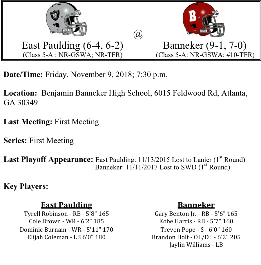 The Banneker Trojans won their first Region title in school history. While the Trojans offense has racked up 30.1 points per game, it has really been the defense that has shined brightest, as they are only giving up 9.4 points per game this season. Gary Benton Jr. has provided much of the spark for the Trojans offense; through 7 games he’s rushed for 877 yards and 10-TDs. Kobe Harris has added 551 yards in 9 games as well. Banneker’s opponent, the East Paulding Raiders were in a three-way tie for second place in their region and lost the tie breaker. So this is not the typical no. 4 seed one might expect. The Raiders beat Kell earlier in the season and only lost to Carrollton by 3 points. They are averaging 26 points per game on offense. We think this game will be closely contested, but we like Banneker to edge out East Paulding by a field goal.
