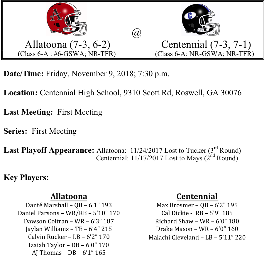 The Allatoona Buccaneers reeled off seven consecutive wins before their loss last week to Sequoyah. Their offense is led by senior running back Daniel Parsons who will be looking to go over the 1,000-yard mark this week. Parsons has run for 959 yards and 8-TDs on the season. Dawson Coltran is the team’s leading receiver. On defense Jansen Twigg has intercepted 5 passes while Calvin Rucker has recorded 6 sacks. Jude Kelley has connected on 9 of 12 field goals with a long of 49 yards. The Centennial Knights offense has scored points in bunches, averaging 38.5 points per game. Most of that offense has come through the air with Max Brosmer passing for 3,459 yards and 31-TDs. Cal Dickie provides balance in the run game with 1,297 yards and 18-TDs. Brosmer’s primary receiving targets have been Richard Shaw (955 yards, 10-TDs) and Rekevian Mathis (678 yards, 6-TDs). So the obvious question is whether the Bucs physical defense be able to contain the air raid of Centennial. We think it’s close for 3 quarters, but we like Centennial to pull away and win by 11 points.
