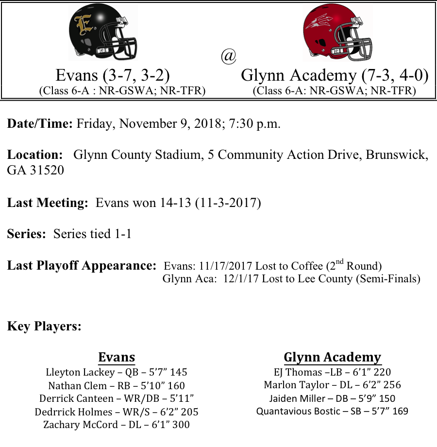 The Evans Knights will travel to Brunswick to take on Glynn Academy. Evans has struggled a bit on offense, only averaging 18.1 points per game on the season. Dual threat freshman quarterback Lleyton Lackey leads the Knights with 1,065 yards of total offense, (499-passing and 566-rushing). Glynn Academy comes into this game on a four game winning streak. Their three losses this season have all come to playoff teams, (Ware, Wayne and Camden). The Terrors are averaging 25.2 points per game on offense and giving up 17.1 points per game on defense. We don’t expect any offensive explosions in this game, but we do expect Glynn to win this game at home by 10 points.