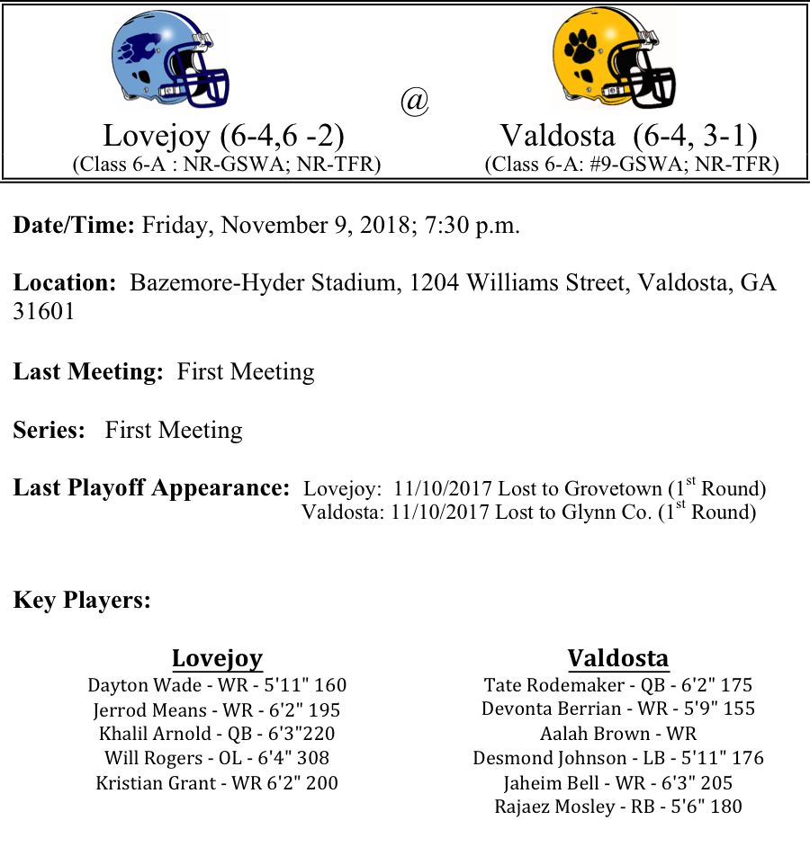 Our first set of 6-A playoff previews are listed below. Our first preview will feature matchups between Lovejoy-Valdosta, Evans-Glynn Academy, Allatoona-Centennial and Northgate-Dacula. Some of the story lines include, Valdosta’s Tate Rodemaker as he continues to smash the Wildcats passing records. Can the Lovejoy Wildcats slow him down…The Evans Knight try to upset the Glynn Academy Red Terrors…Does Glynn have enough fire-power to make another deep run in the post season…Will the real Allatoona please stand up. The Bucs will need a solid defensive performance to slow down Centennials “Air Brosmer”. The Centennial quarterback has passed for almost 3,500 yards on the season…The Northgate Vikings will have to figure out a Dacula Falcons team that is only surrendering 14.2 points per game. Do the Falcons have enough weapons on offense to get the job done…