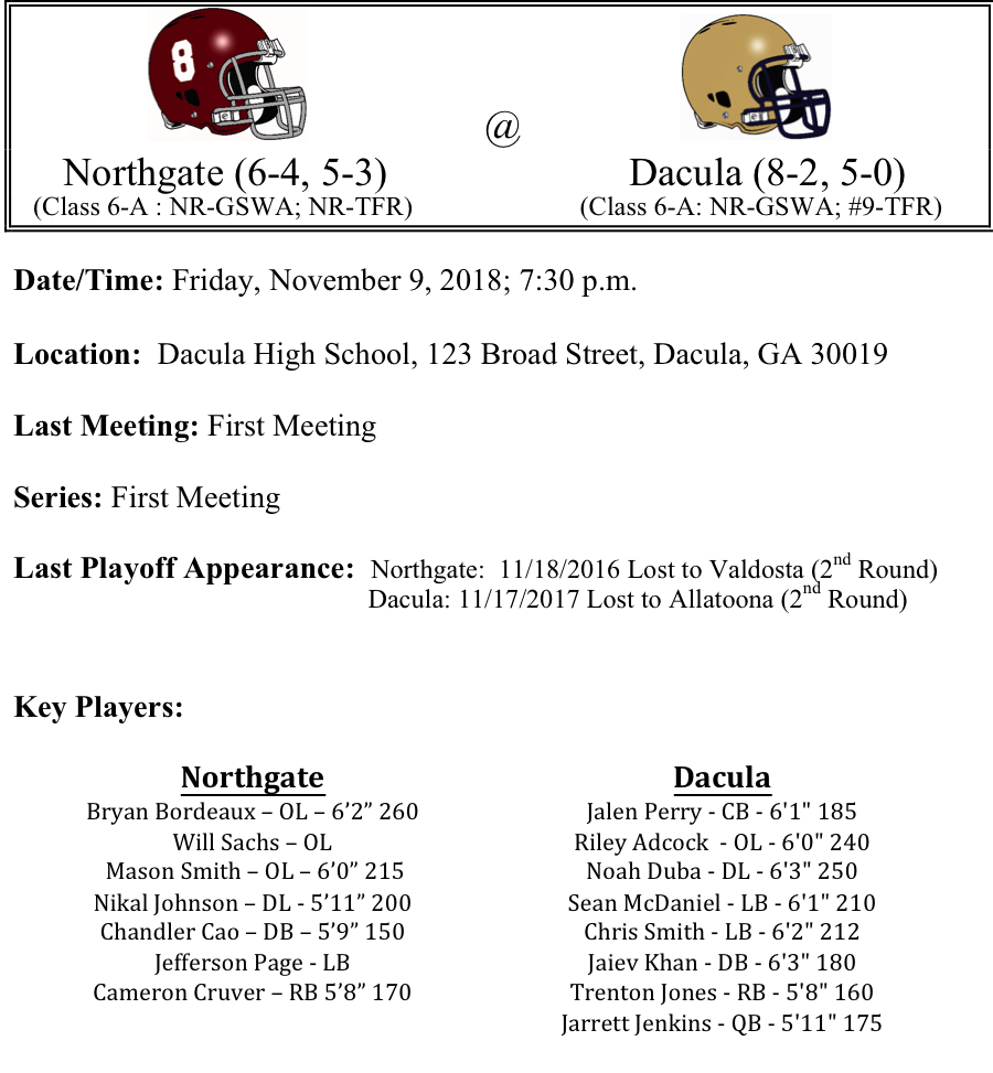 The Northgate Vikings have been up and down this season. They have big wins over playoff teams such as Starr’s Mill and Region foe Creekside. The Vikings are averaging 25 points per game, but are surrendering 27.1 points per game. Their opponent this week is the Dacula Falcons. Coach Clint Jenkins has the Falcons flying high again this season. Dacula is averaging 31.2 points per game, while the defense has been stout, only surrendering 14.2 points per game. Their only losses come at the hands of a pair of 7-A playoff teams. Trenton Jones has rushed for over 1,000 yards while quarterback Jarrett Jenkins has passed for over 1,400 yards. While they haven’t had much press around the state, Dacula should be primed to make a deep playoff run. We like the Falcons by two touchdowns.