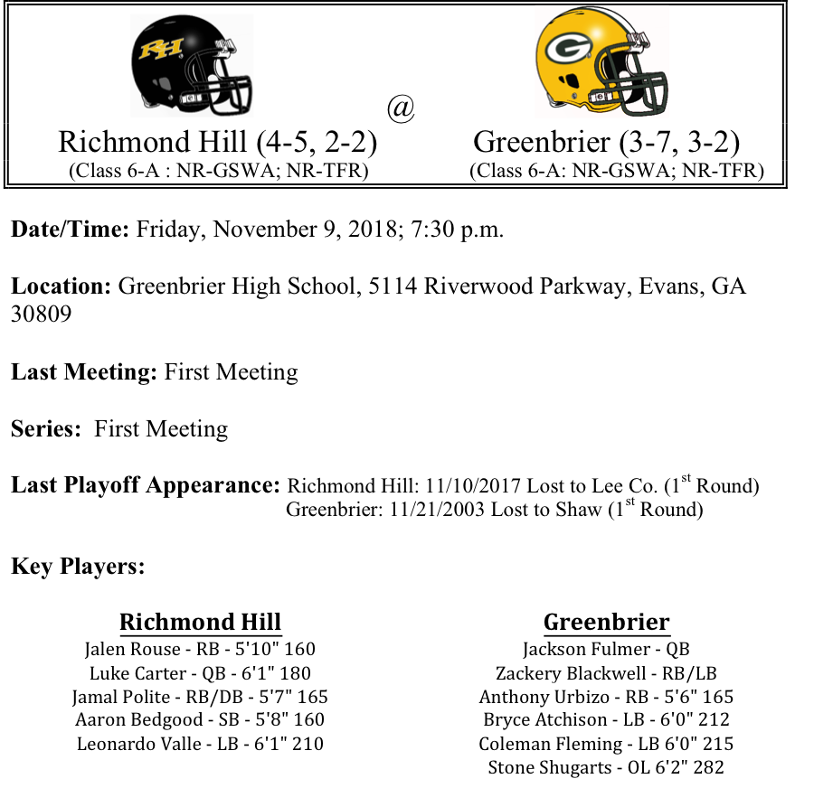 The Richmond Hill Wildcats will travel to the Central Savannah River Area to face the Greenbrier Wolfpack on Friday. Richmond Hill has done most of their damage on offense by way of the ground game. Jalen Rouse and Jamal Polite have combined for over 1,000 yards rushing and 11-TDs. The Wildcats defense has been pretty good as well, only giving up 15.6 points per game. Similar to Richmond Hill, Greenbrier has done most of their work on offense on the ground. Zackery Blackwell and Anthony Urbizo have combined for over 900 yards rushing. Coleman Flemming leads the defense with 121 total tackles, 69 of those were solo tackles. The Greenbrier defense has been pretty good, surrendering 18.1 points per game, but we don’t think that their offense can score enough to outlast Richmond Hill. We like the Wildcats by two touchdowns.