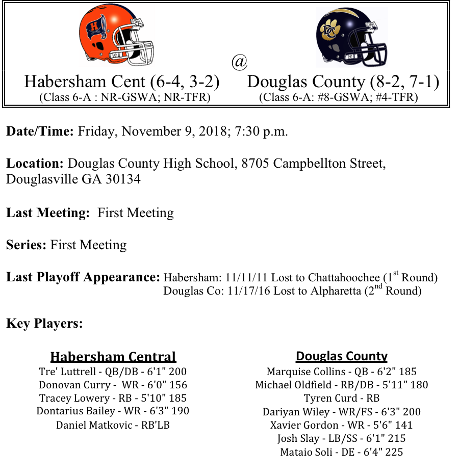 Our final set of 6-A playoff previews are listed below. The matchups include Lakeside, Evans-Effingham County, Mundy’s Mill-Lee County, Habersham Central-Douglas County, and Pope-Creekview. Lakeside Evans travels to Effingham County in hopes of slowing down the Rebels tandem of sophomore running backs…Meanwhile, Mundy’s Mill will take on Lee County in a true David versus Goliath match-up. Lee is the overwhelming favorite to repeat as state champs…Tre’ Luttrell and the Raiders from Mt. Airy travel to Douglas County to face one of the best defenses in 6-A. Can Douglas contain Luttrell…Finally, one of the best rushing teams in 6-A faces off against one of the best running backs in 6-A as Pope brings their 2,900+ yards of rushing offense into the Grizzly Den to see if they can derail Cade Radam and the Grizzlies…