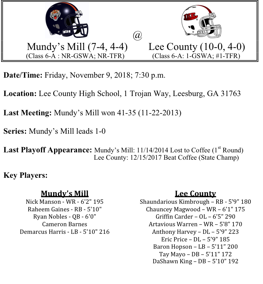 The Lee County Trojans have looked almost invincible this season. The Trojans offense is averaging 42.4 points per game, led by Kyle Toole, who has passed for over 1,700 yards on the season. Chauncey Magwood and Daveon Sanders have been two of his top targets. Yet the biggest story for the Trojans has been the defense, which is giving up an average of 3.7 points per game. (That’s no misprint!) Mundy’s Mill does not have a win against a ranked opponent this season, but almost upset the Tucker Tigers back in September. Mundy’s Mill is averaging 26 points per game this season. Raheem Gaines has rushed for 1,290 yards and 6-TDs on the season for the Tigers. It will be interesting to see how he fares against a Lee County defense that a one point was giving up just under seven, yes seven rushing yards per game. We like Lee County big this week by four touchdowns.