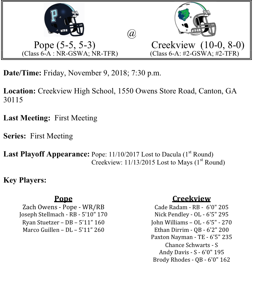 Coach Adam Carter has come to Creekview and in his first season led the Grizzlies to their first region title and first undefeated season in school history. The Grizzlies are powered by a physical offensive line anchored by tackles John Williams and Nick Pendley. Cade Radam has been a workhorse this season for the Grizzlies as he’s rushed for 1,531 yards and 18-TDs. The Grizzlies defense has been stout as well this season, only surrendering 12.5 points per game. The Pope Greyhounds generate most of their offense on the ground. Joseph Stellmach has rushed for 1,064 yards for a team that has rushed for almost 3,000 yards this season. Ryan Stuetzer has seven interceptions on the season. We think that the Creekview defense will be able to slow down the Pope ground game this week and win this one big, Grizzlies by three touchdowns.