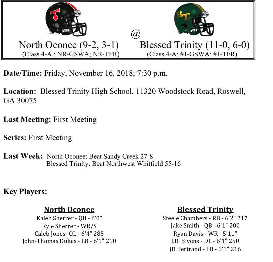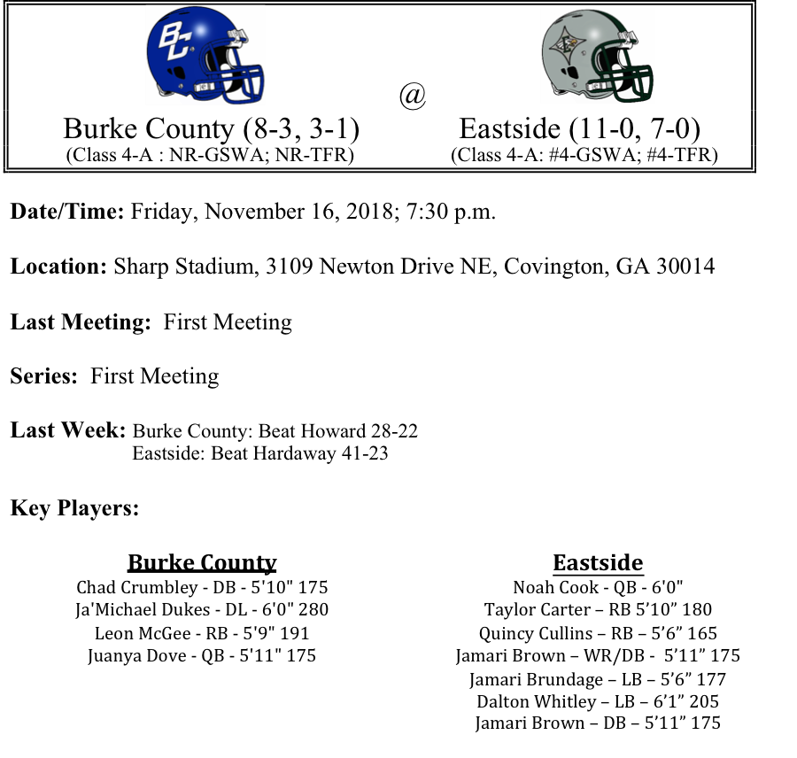 Our final set of week two GHSA-4-A Playoff previews are listed below. This preview features matchups between Burke County-Eastside, North Oconee-Blessed Trinity, Thomson-Cairo, and Troup-Pickens. Congratulations to all of these teams that won their first round game. Best of luck to you all as you play this Friday.