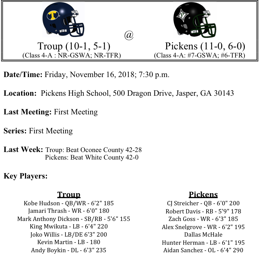 The Pickens Dragons are having a historic season. They won their first region title in school history and won their first playoff game in school history last week as well. We’ve had a chance to watch both teams play this season and we think that outside of the Marist-St.Pius game, this is the most intriguing matchup. Troup is averaging 37.8 points per game while Pickens is averaging 46 points per game. Pickens quarterback C.J. Streicher has passed for 1,325 yards and is closing in on 1,000 yards rushing. Robert Davis has also been a key cog in the ground game with 697 yards rushing and 12-TDs. Troup will counter with quarterback Kobe Hudson who has passed for 2,806 yards and 26-TDs. Hudson is also closing in on 1,000 yards rushing. Joko Willis and James Thrash have combined for 1,375 yards receiving and 16-TDs. It will be interesting to see Pickens face perhaps the most talented team they’ve faced all season. If Troup’s King Mwikuta and Andy Boykin can clog up holes, it could be a long night for the Dragons. We think this one comes down to the wire, but we’ll take Pickens by a field goal.