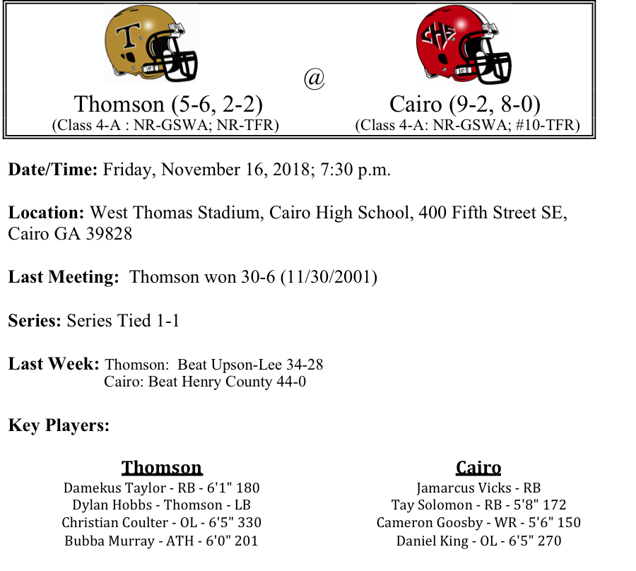 It has been 17 years since Thomson and Cairo have squared off. The Syrupmakers are averaging 33.1 points per game, while their defense is giving up 10 points per game. In the first round of the playoffs, they recorded their third shutout of the season. The Thomson Bulldogs got off to a slow start this season, but have won three out of their last 4 games. The Bulldogs are averaging 23.8 points per game while the defense is surrendering 27.9 points per game. Most of Thomson’s offense comes by way of the ground. Damekus Taylor has rushed for 1,256 yards on the season, including 178 yards last week against Upson-Lee. Thomson is looking to get to the quarterfinals for the 3rd consecutive season. But we think That Cairo will be up to the task to slow down Taylor and the Bulldogs. We like Cairo By nine this week.