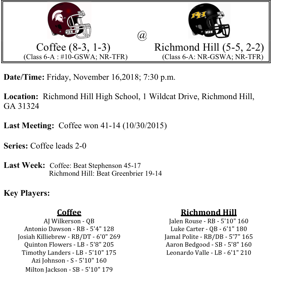 Our final set of week two GHSA-6-A Playoff previews are listed below. This preview features matchups between Coffee-Richmond Hill, Lanier-Harrison, Effingham County-Lee County, and Habersham Central-Creekview. Congratulations to all of these teams that won their first round game. Best of luck to you all as you play this Friday.